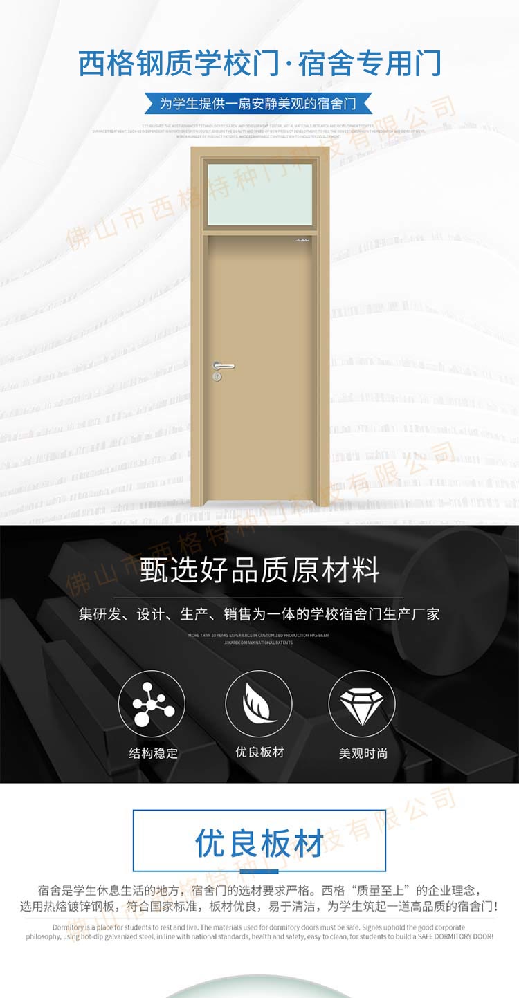 產品簡介:chnsige西格特種門,專業生產學校門,學校宿舍門,學校公寓門,學校宿舍門,鋼質宿舍門,多鐘款式、顏色,尺寸可定制。