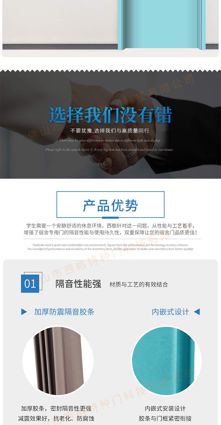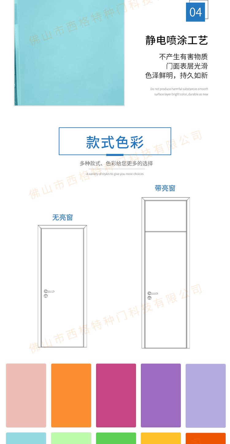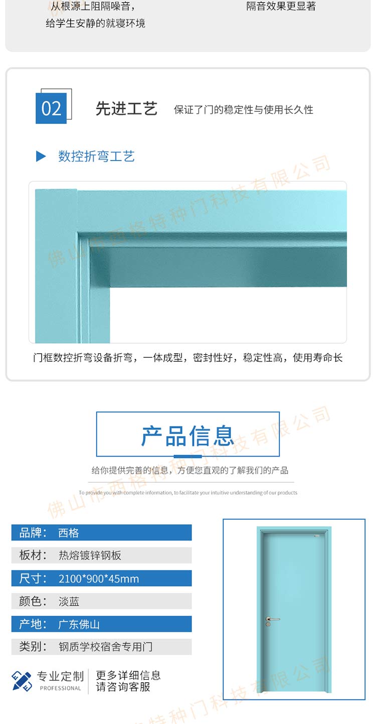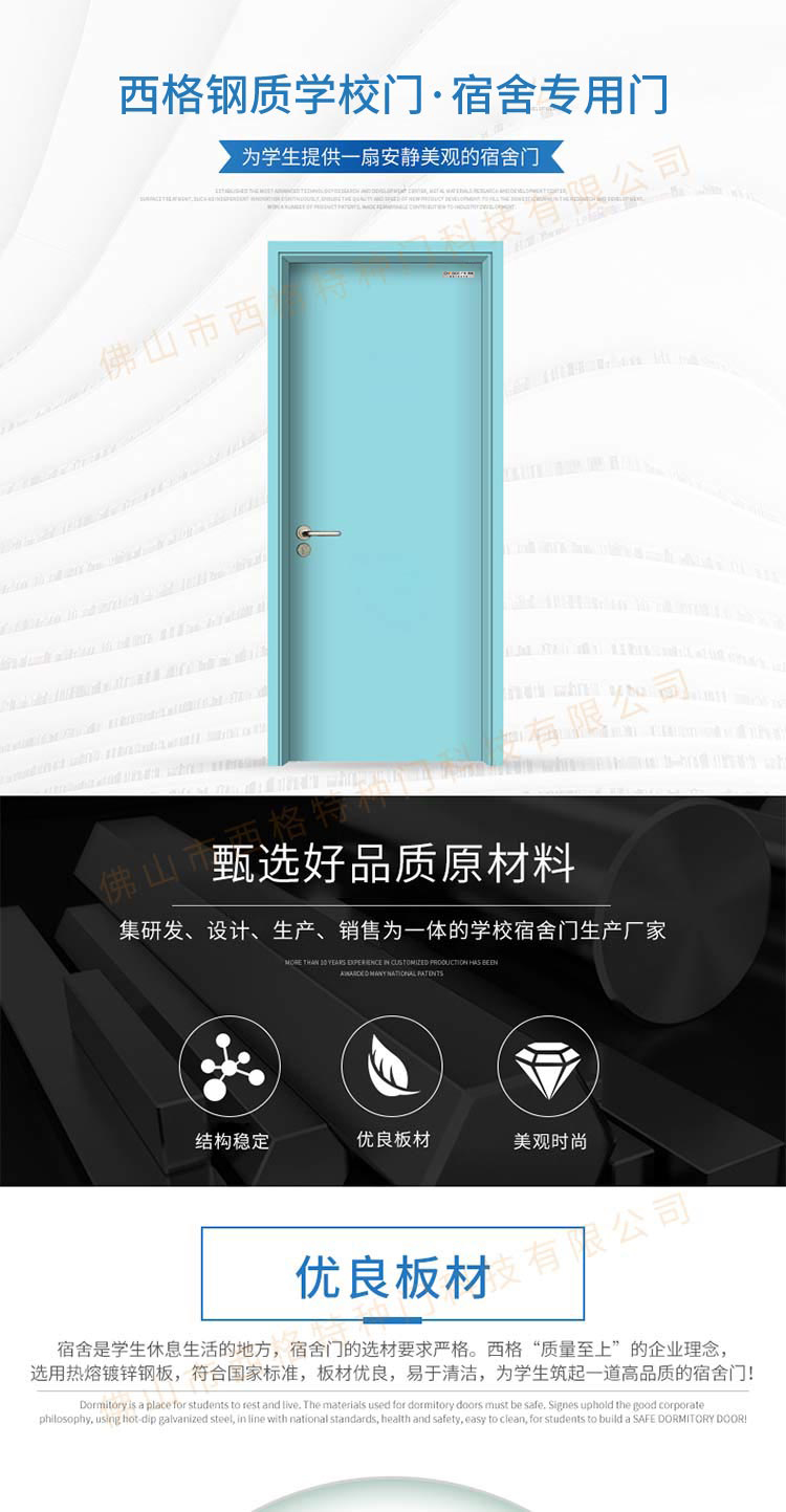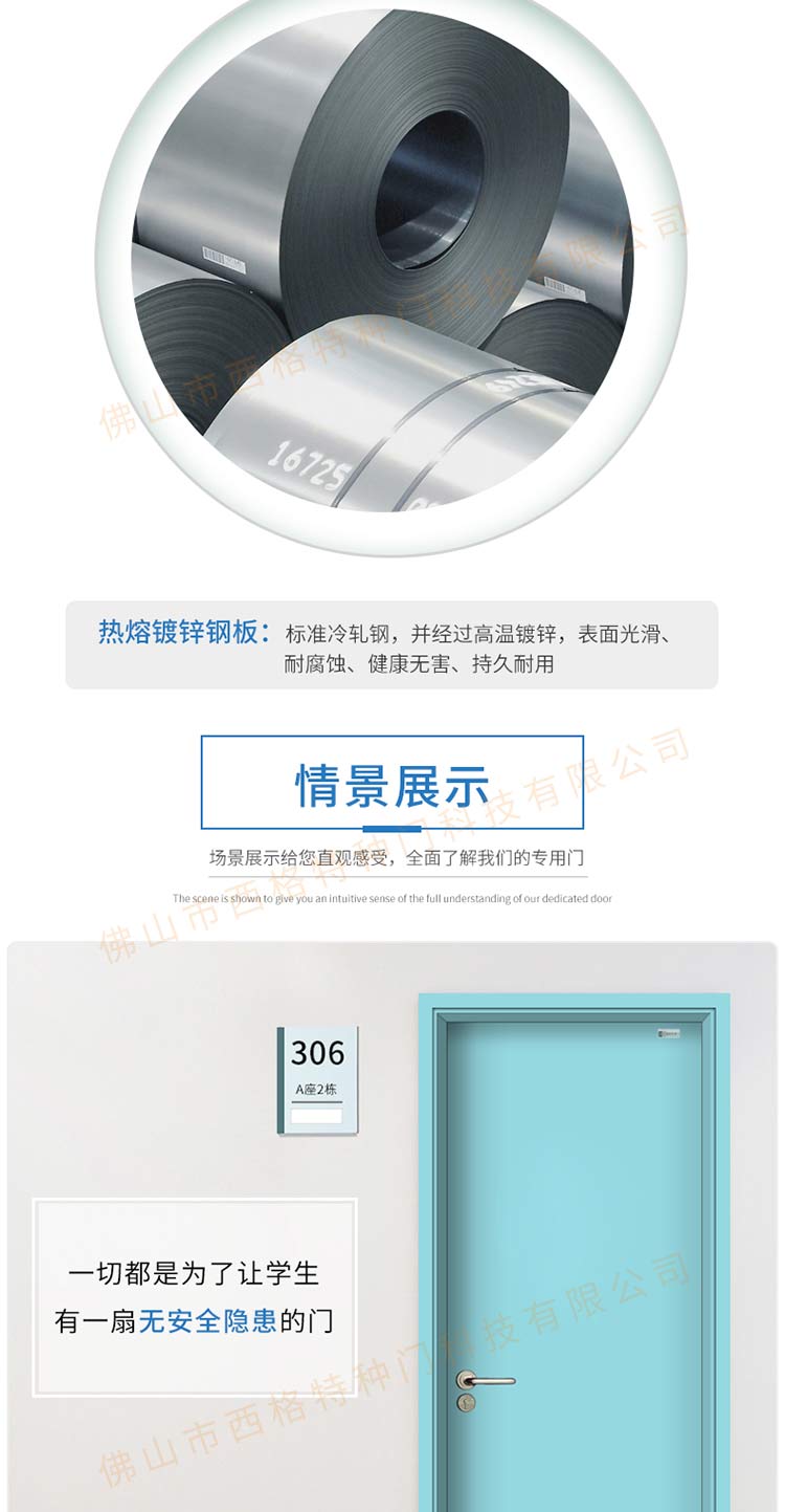 產品簡介:chnsige西格特種門,專業生產學校門,學校宿舍門,學校公寓門,學校宿舍門,鋼質宿舍門,多鐘款式、顏色,尺寸可定制。