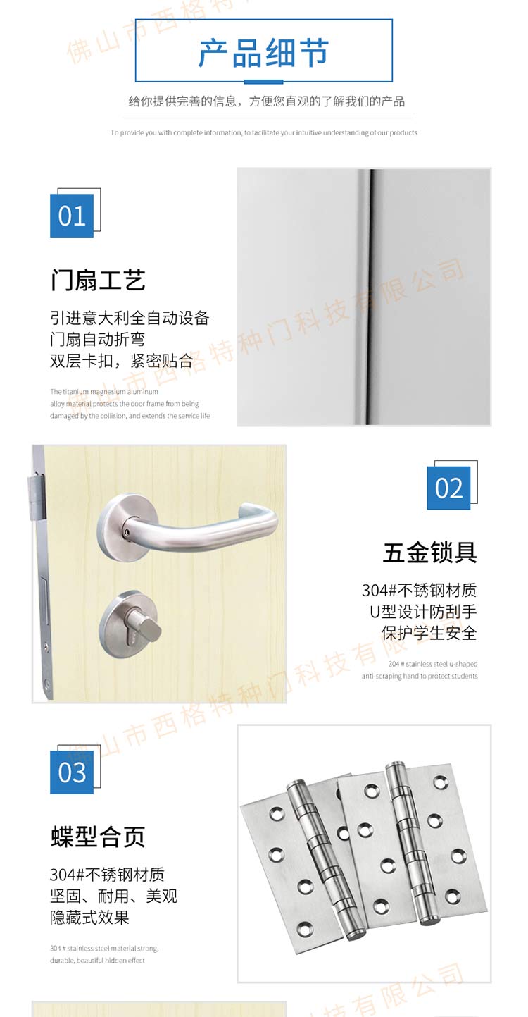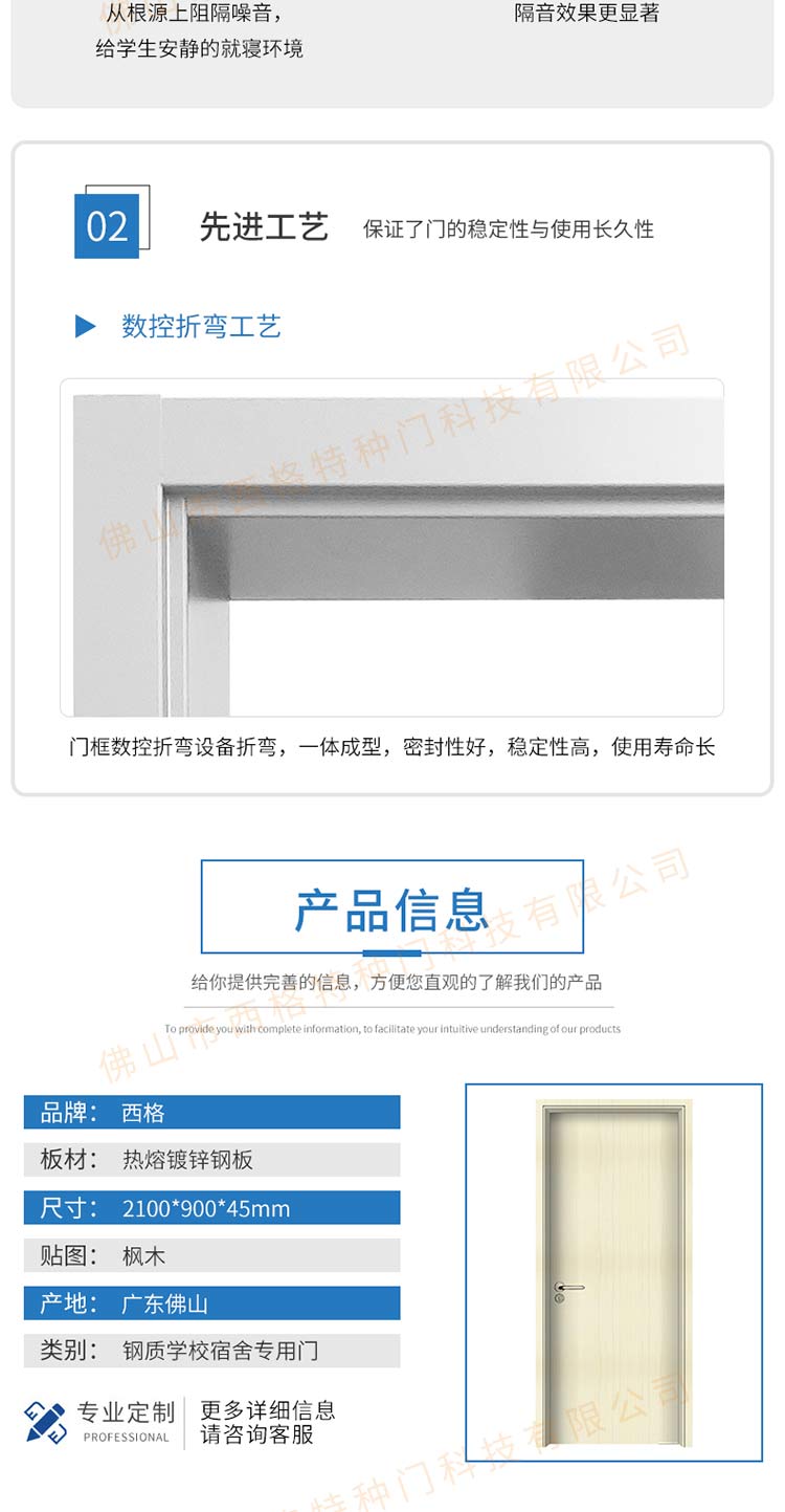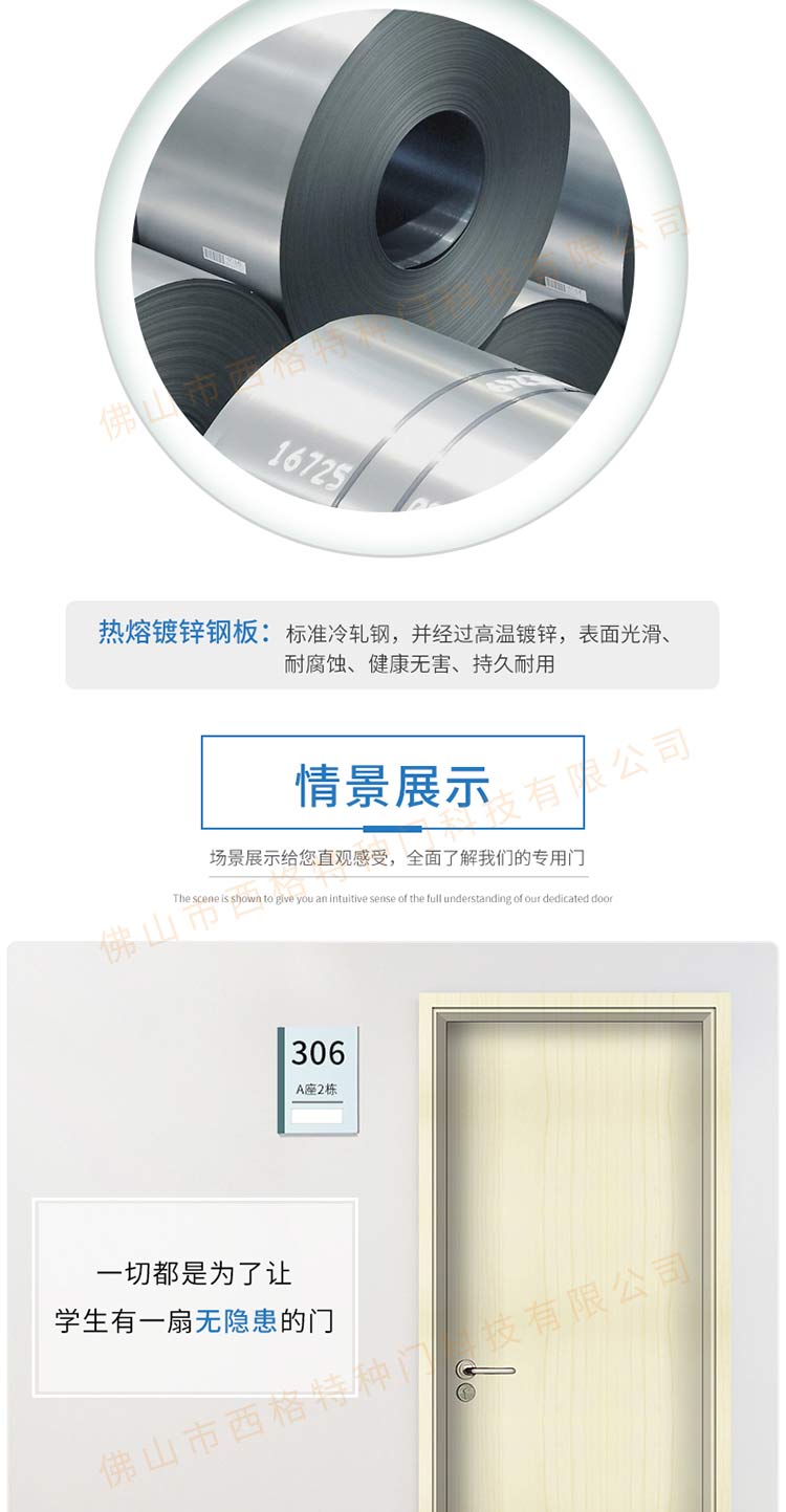 產品簡介:chnsige西格特種門,專業生產學校門,學校宿舍門,學校公寓門,學校宿舍門,鋼質宿舍門,多鐘款式、顏色,尺寸可定制。