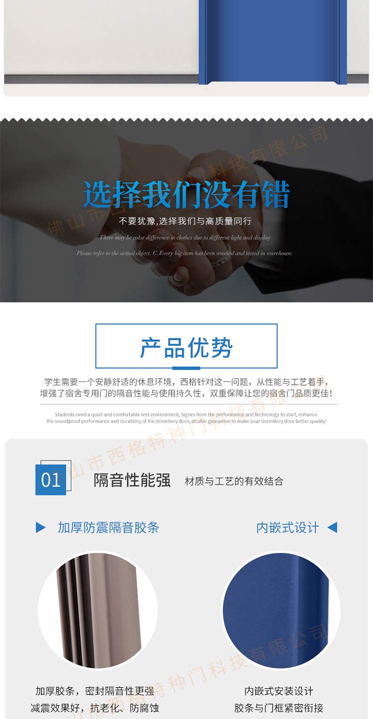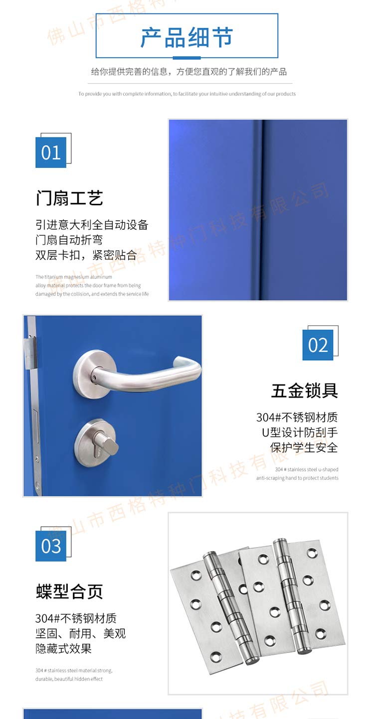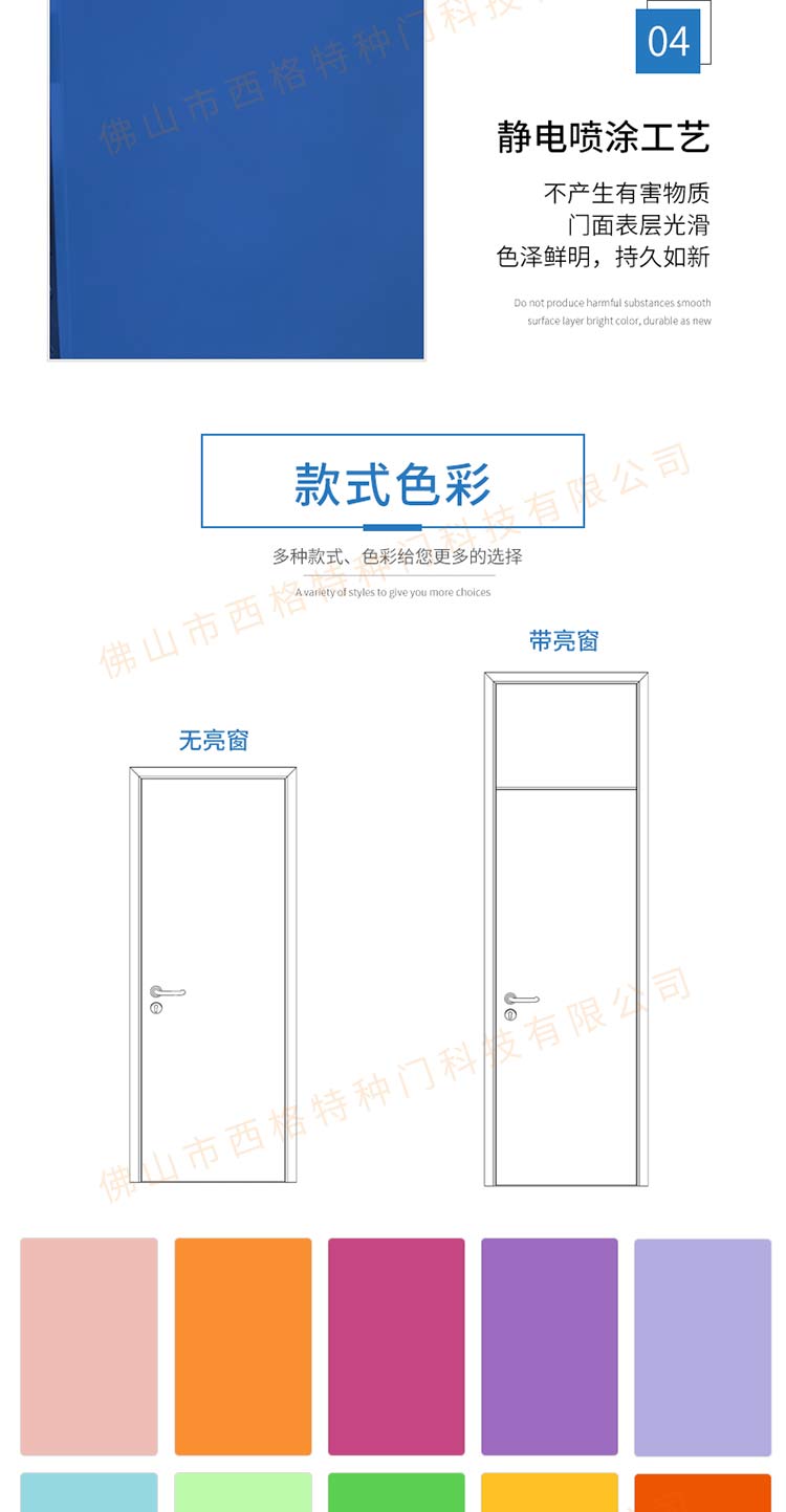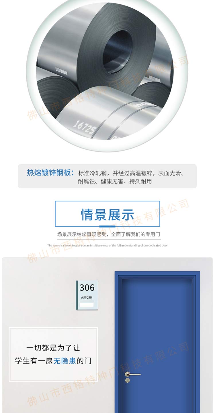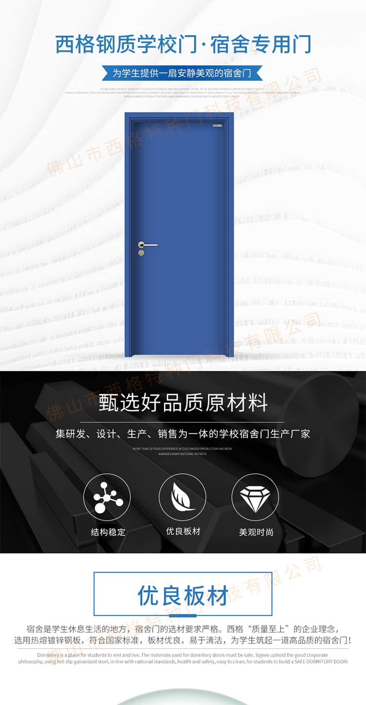 產品簡介:chnsige西格特種門,專業生產學校門,學校宿舍門,學校公寓門,學校宿舍門,鋼質宿舍門,多鐘款式、顏色,尺寸可定制。