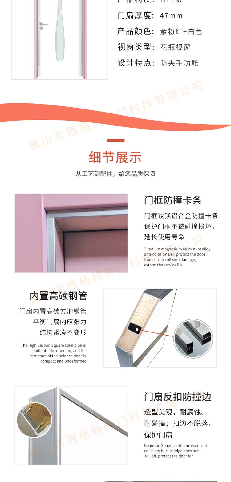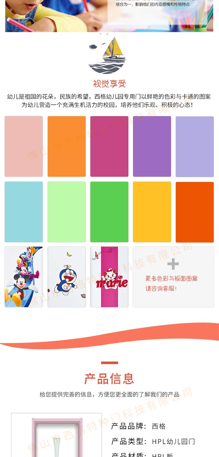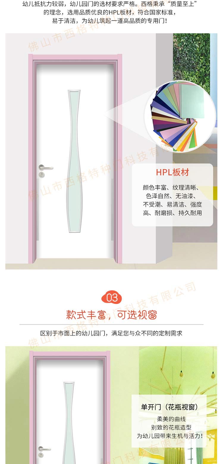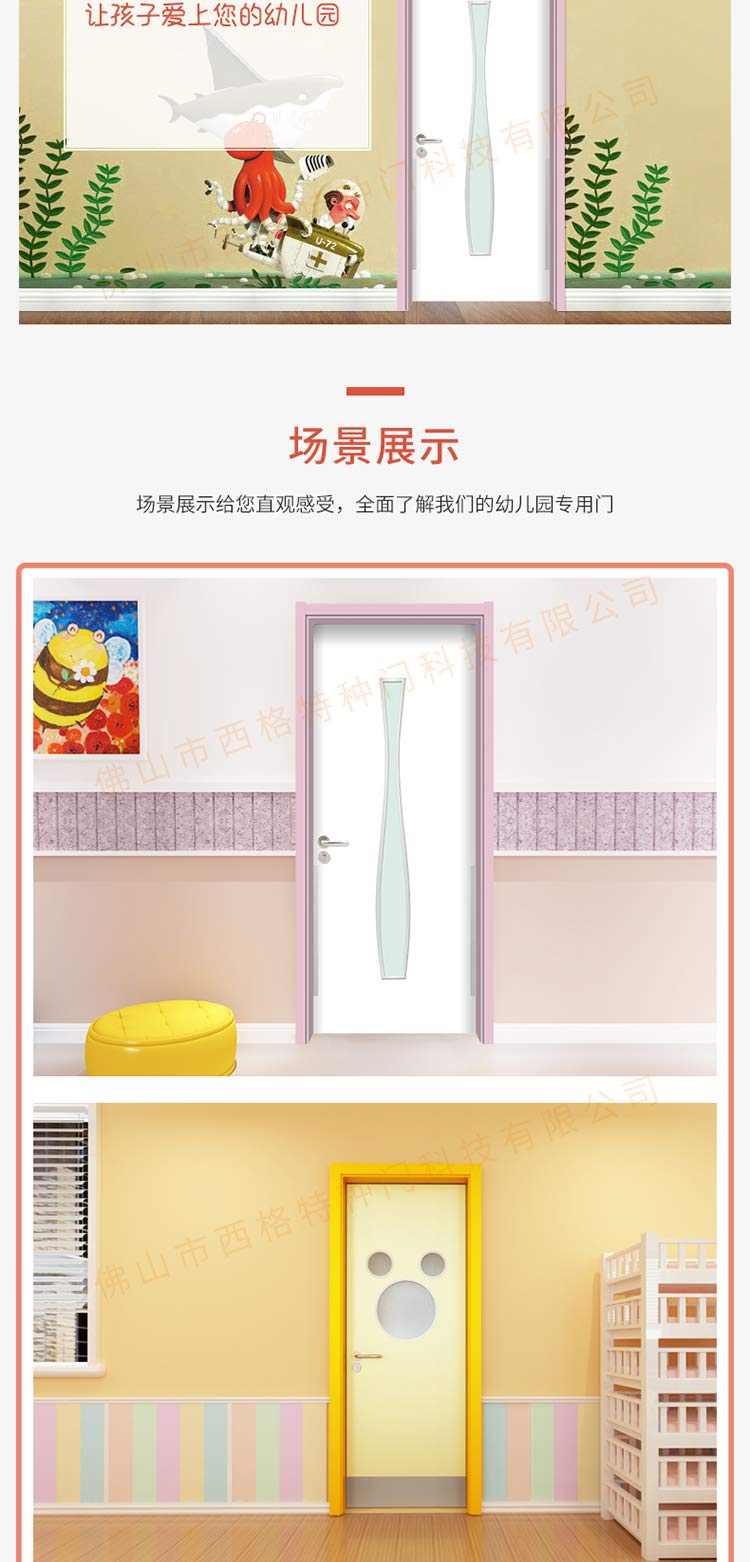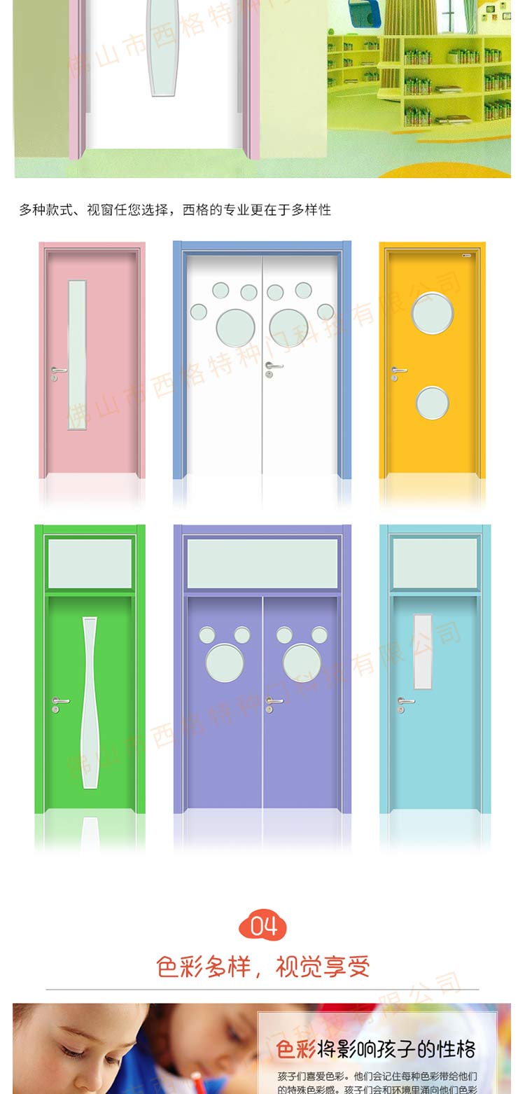 產(chǎn)品簡(jiǎn)介:chnsige西格特種門,專業(yè)生產(chǎn)幼兒園門,防夾手幼兒園門,多鐘款式、顏色,尺寸可定制。