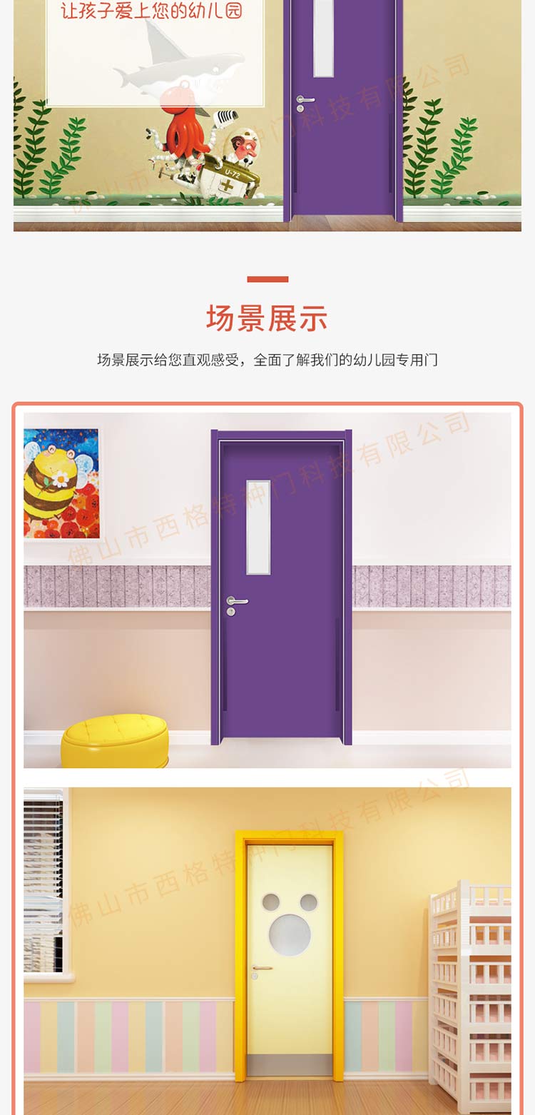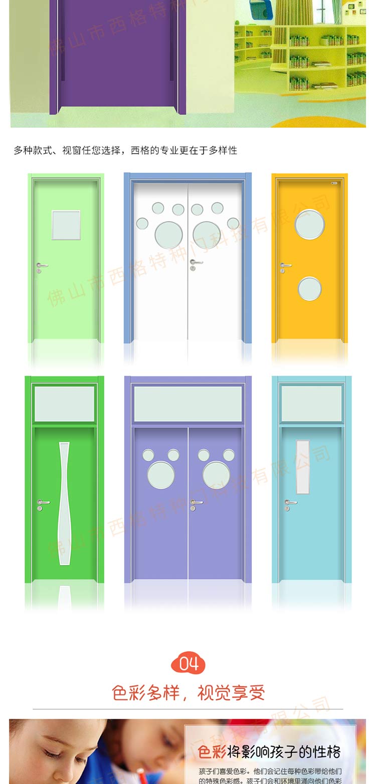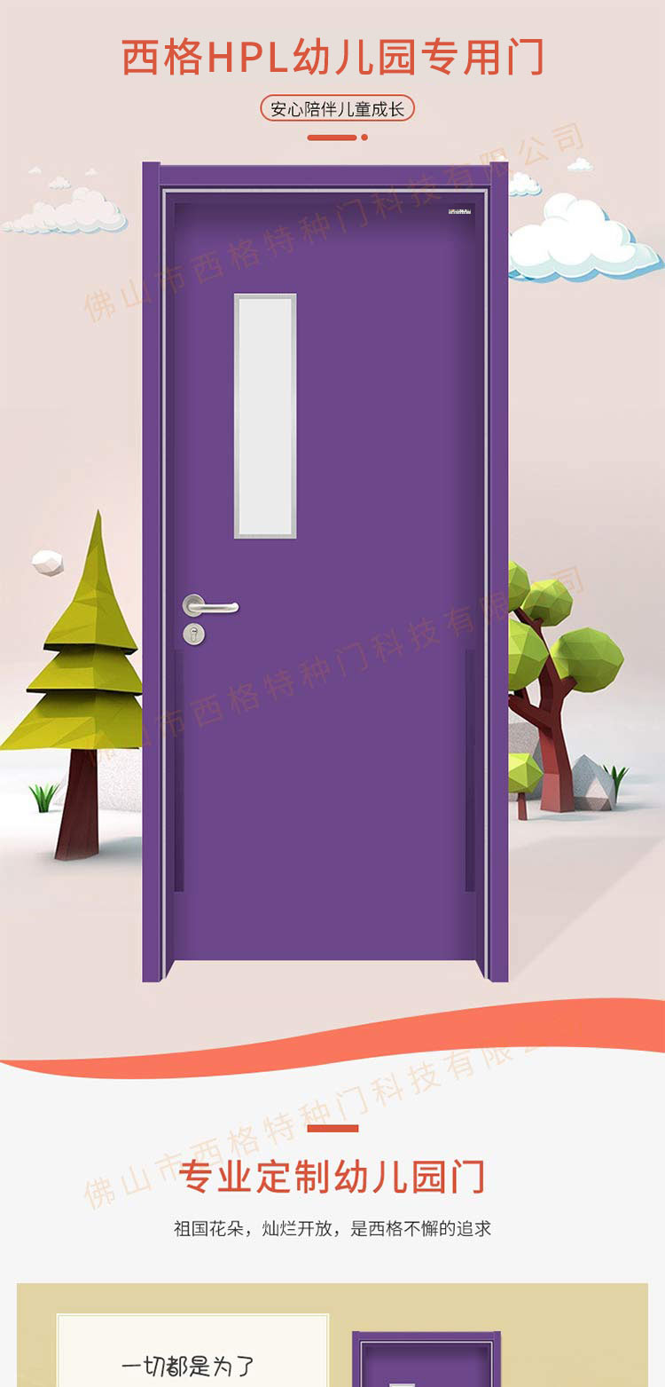 產品簡介:chnsige西格特種門,專業生產幼兒園門,防夾手幼兒園門,多鐘款式、顏色,尺寸可定制。