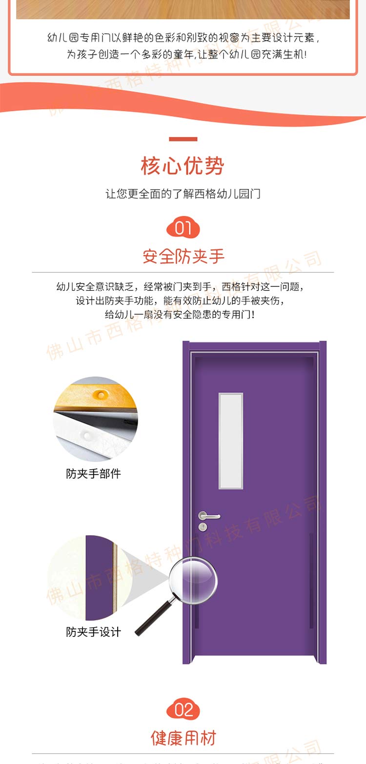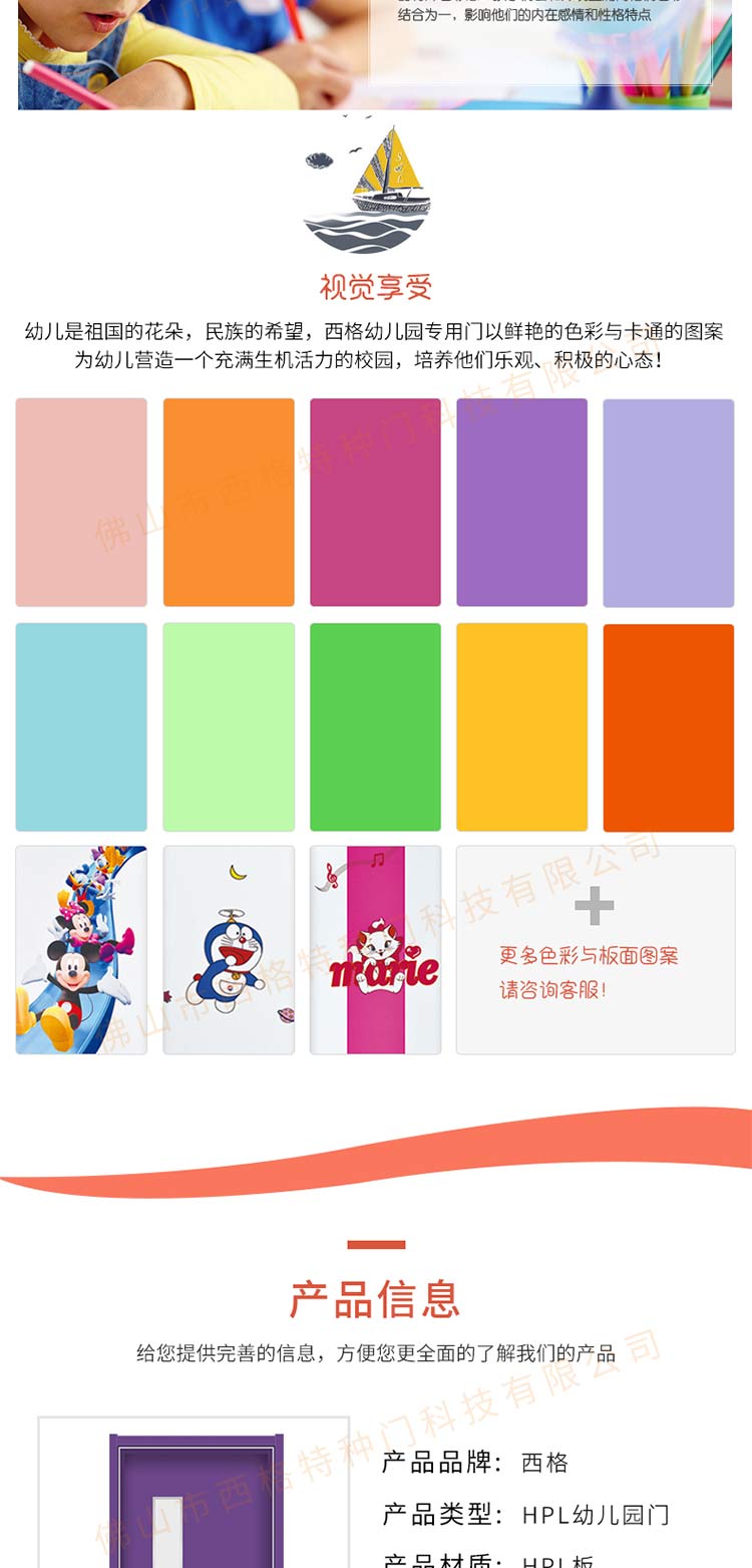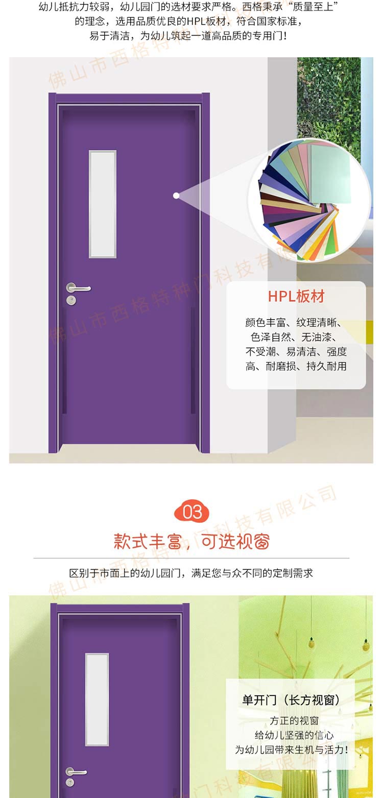 產品簡介:chnsige西格特種門,專業生產幼兒園門,防夾手幼兒園門,多鐘款式、顏色,尺寸可定制。