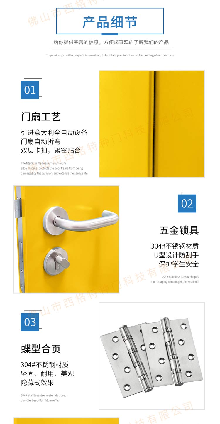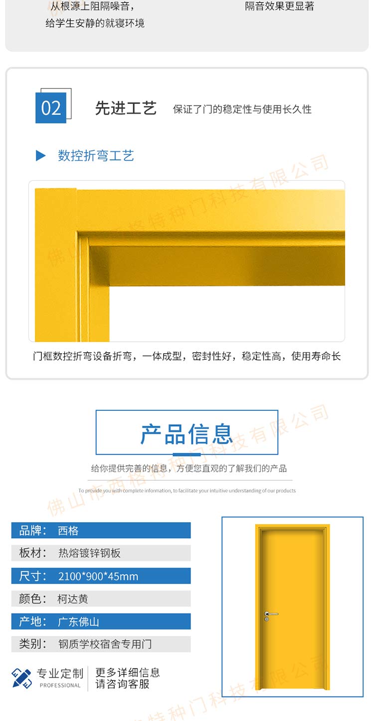 產品簡介:chnsige西格特種門,專業生產學校門,學校宿舍門,學校公寓門,學校宿舍門,鋼質宿舍門,多鐘款式、顏色,尺寸可定制。
