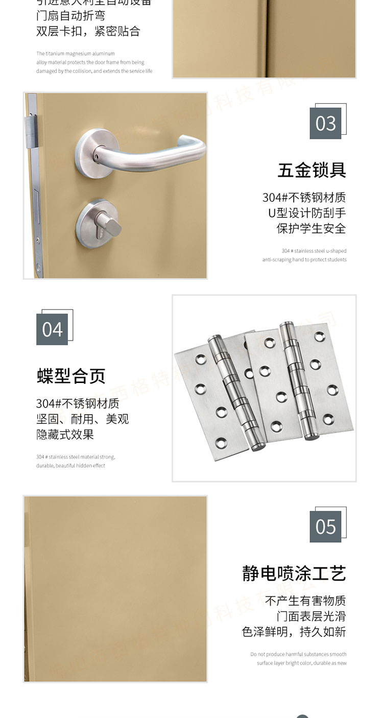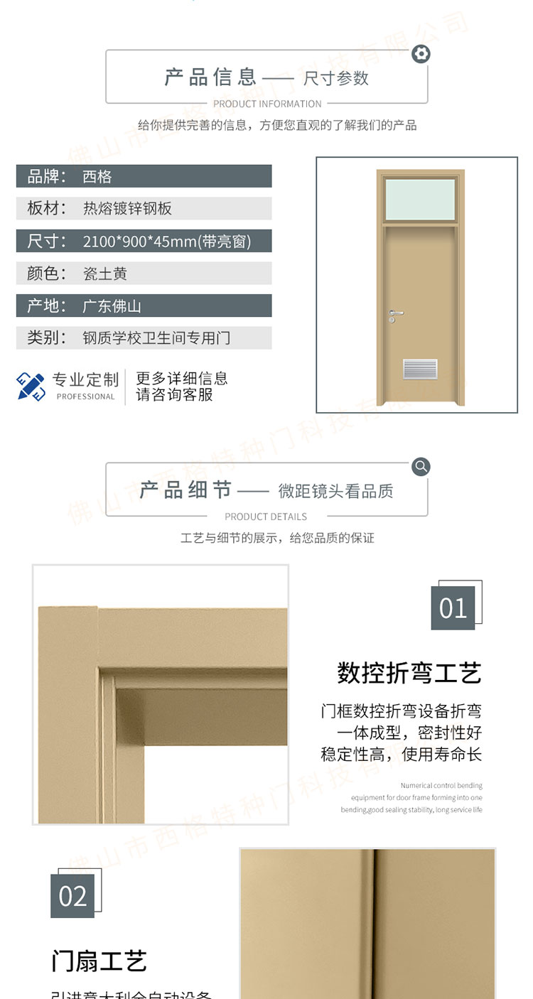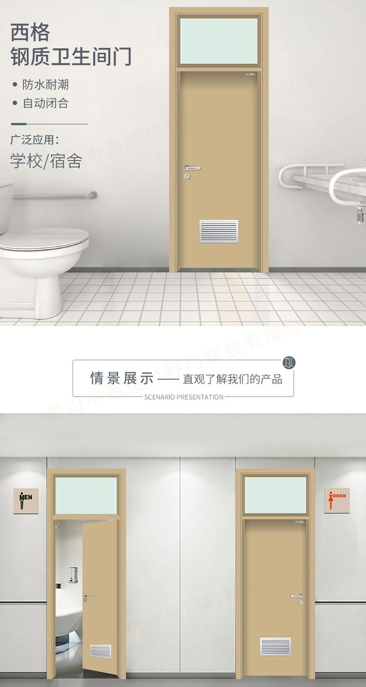 產品簡介:chnsige西格特種門,專業生產學校門,學校衛生間門,學校洗手間門,鋼質洗手間門,多鐘款式、顏色,尺寸可定制。