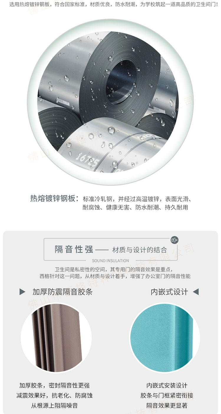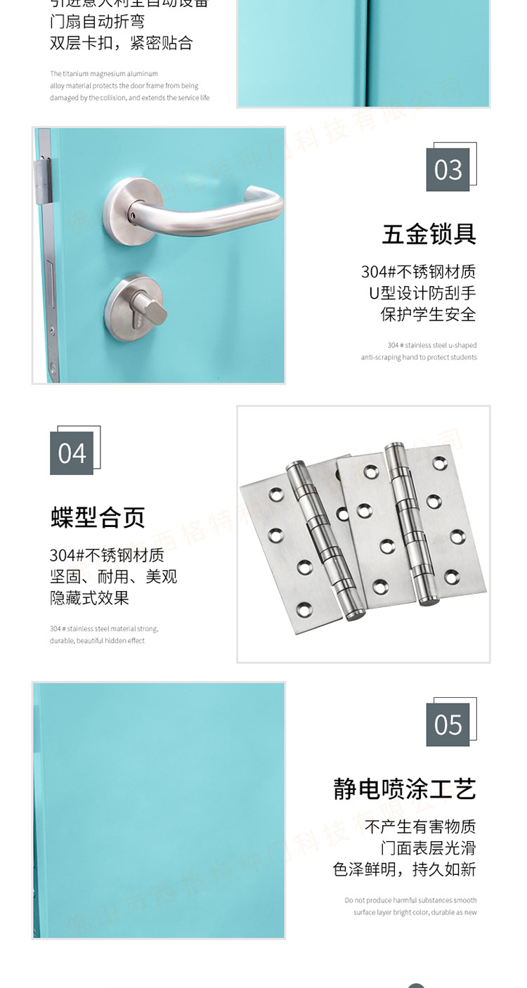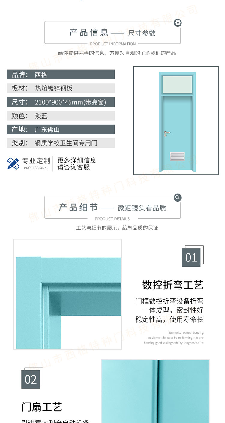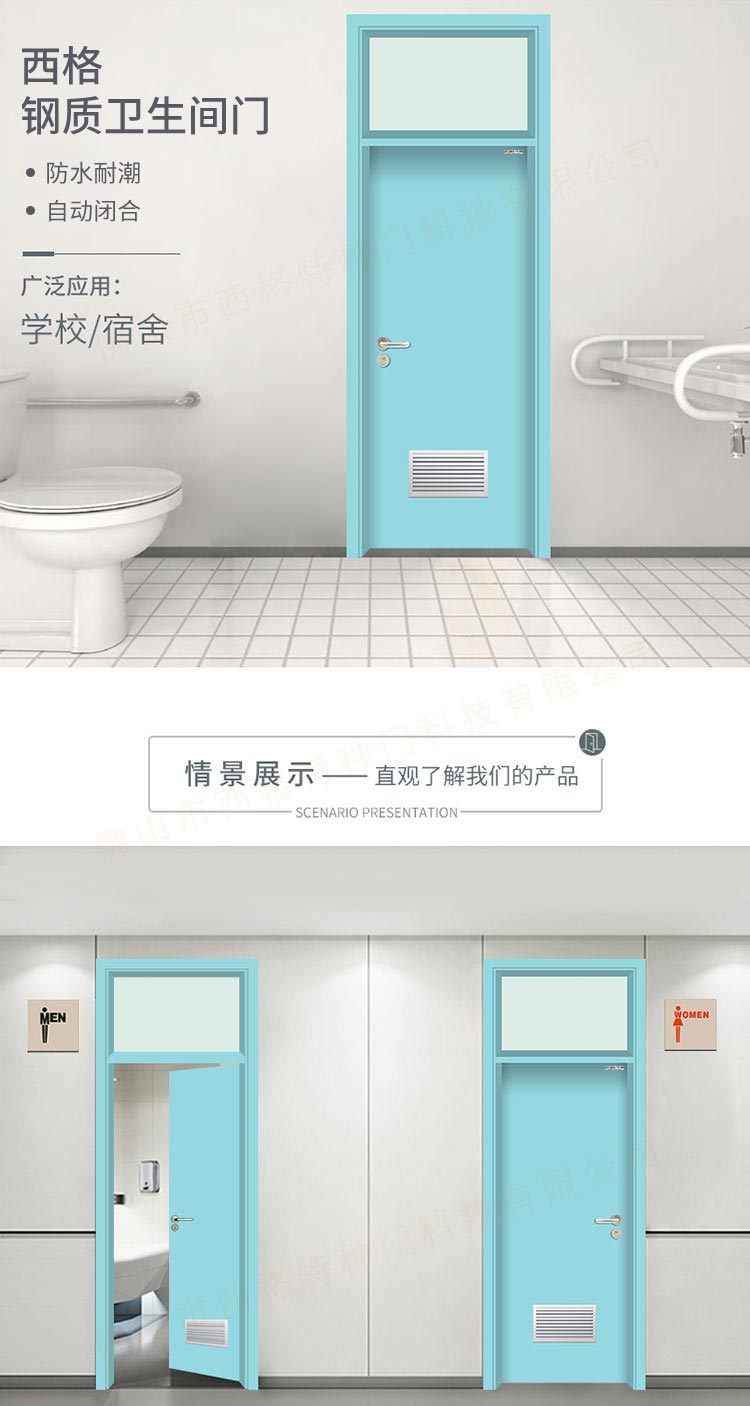 產(chǎn)品簡(jiǎn)介:chnsige西格特種門,專業(yè)生產(chǎn)學(xué)校門,學(xué)校衛(wèi)生間門,學(xué)校洗手間門,鋼質(zhì)洗手間門,多鐘款式、顏色,尺寸可定制。