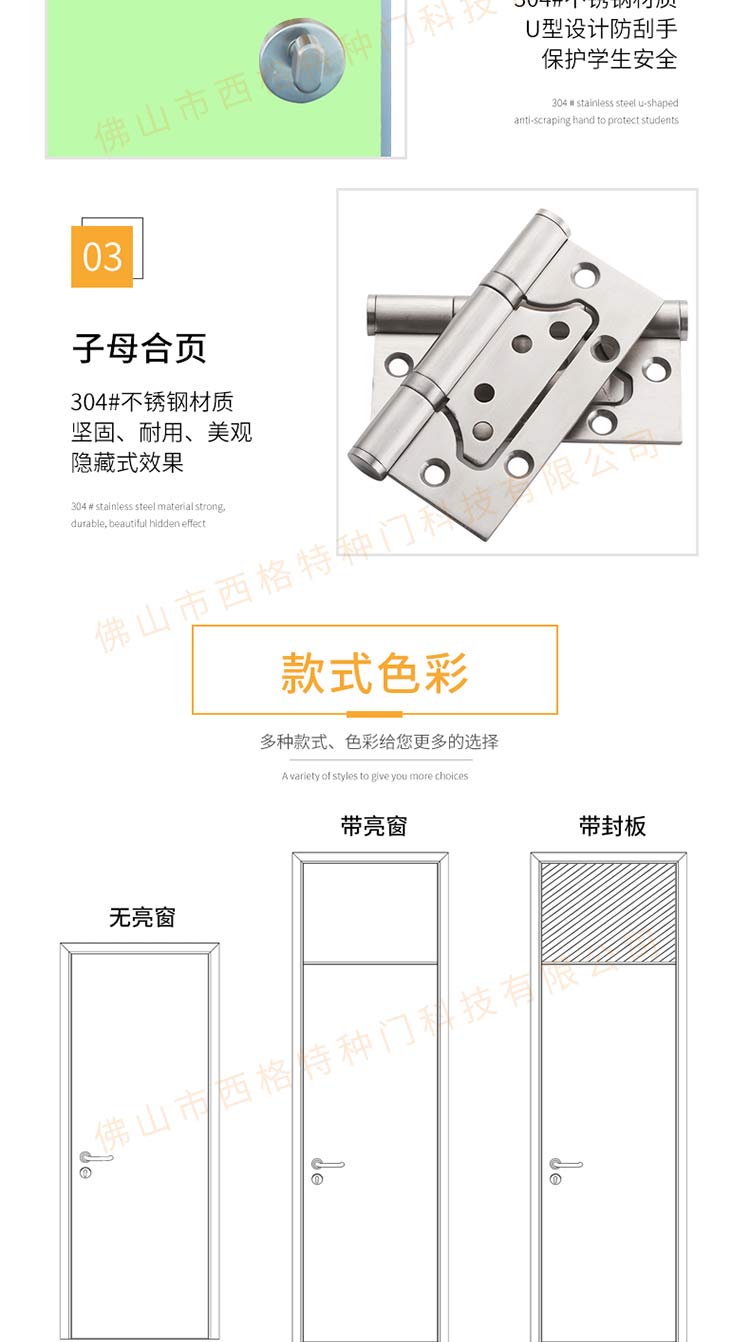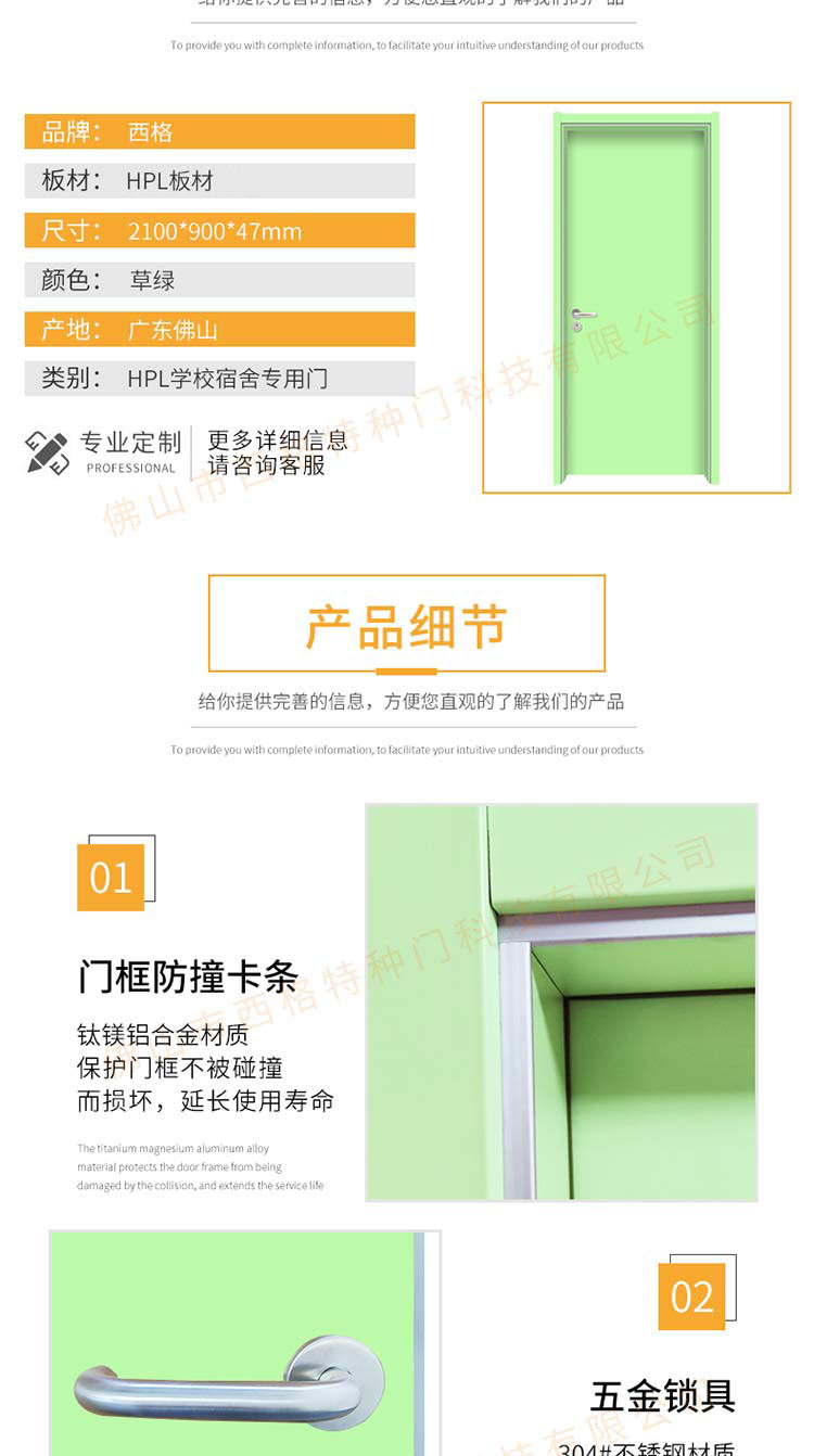 產品簡介:chnsige西格特種門,專業生產學校宿舍門,木質學校宿舍門,學校宿舍木門,學生宿舍門,多鐘款式、顏色,尺寸可定制。