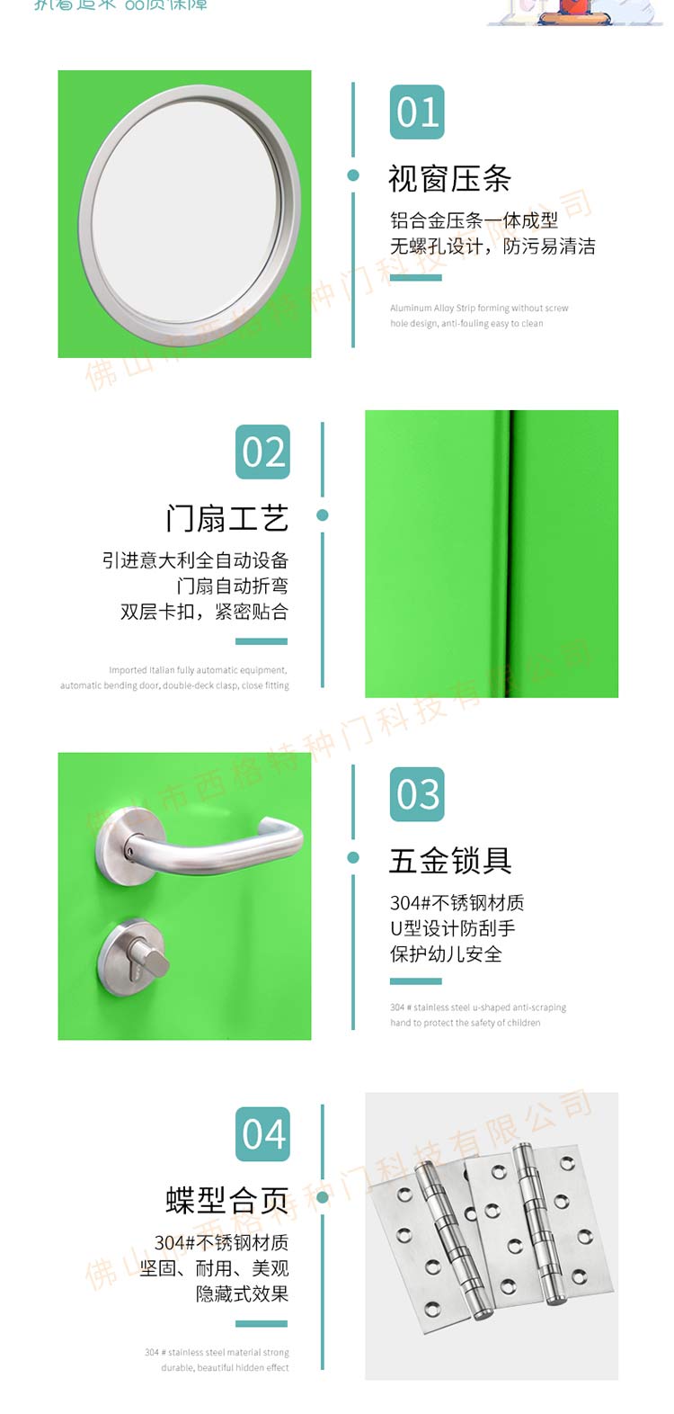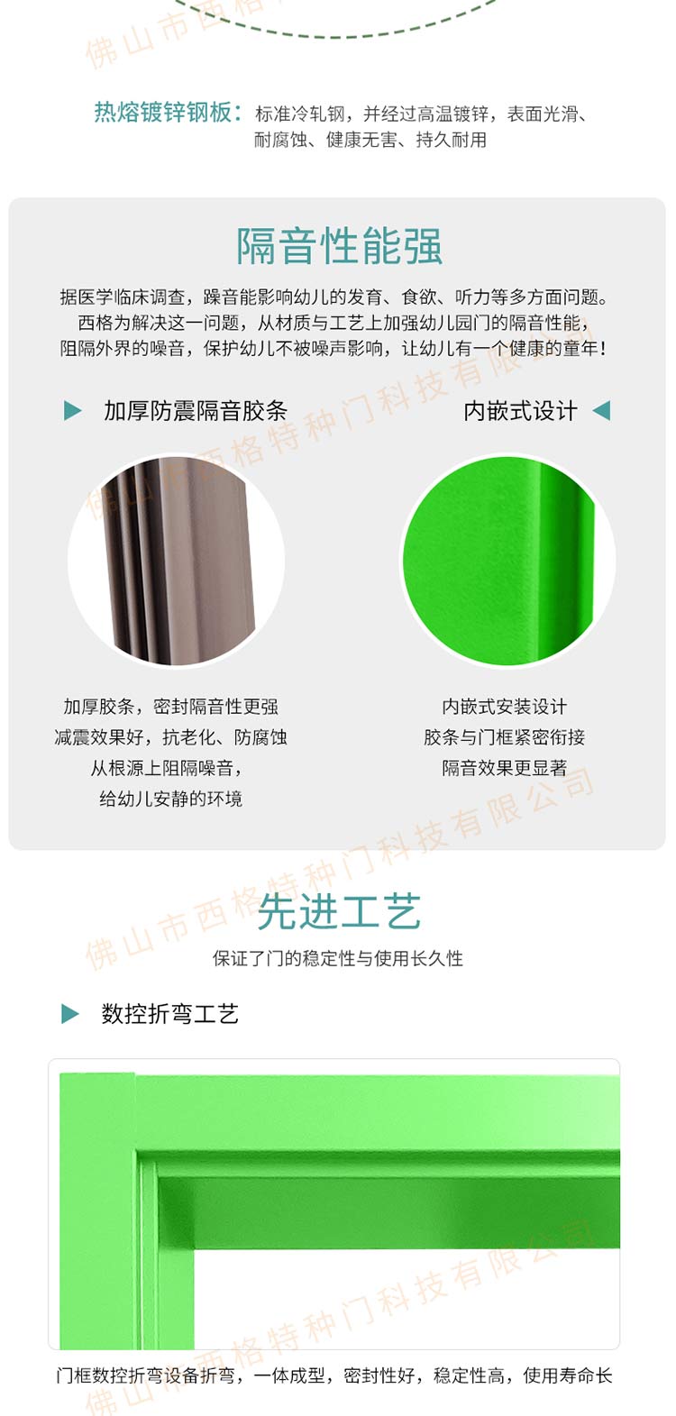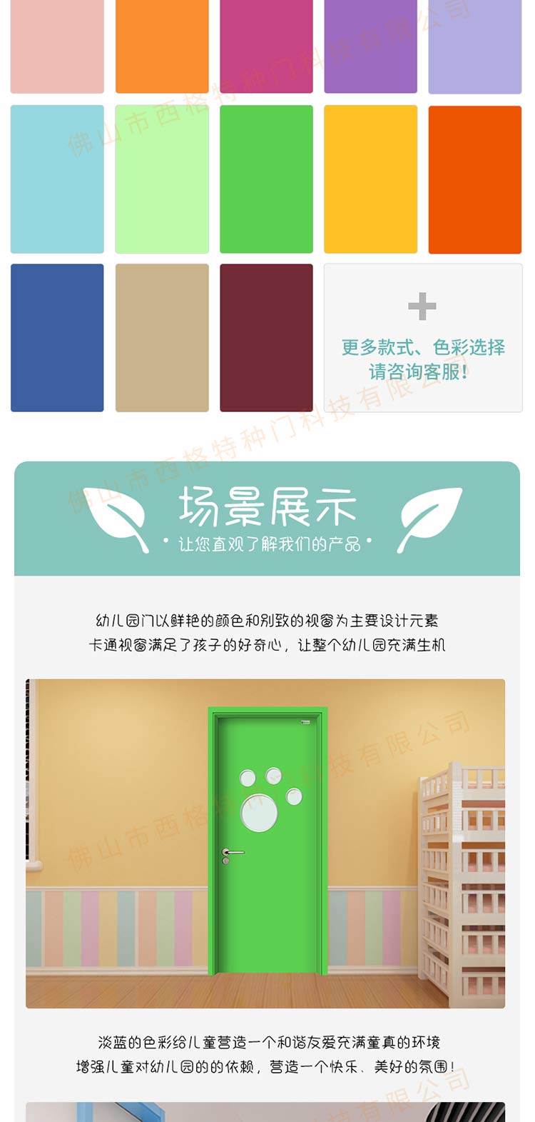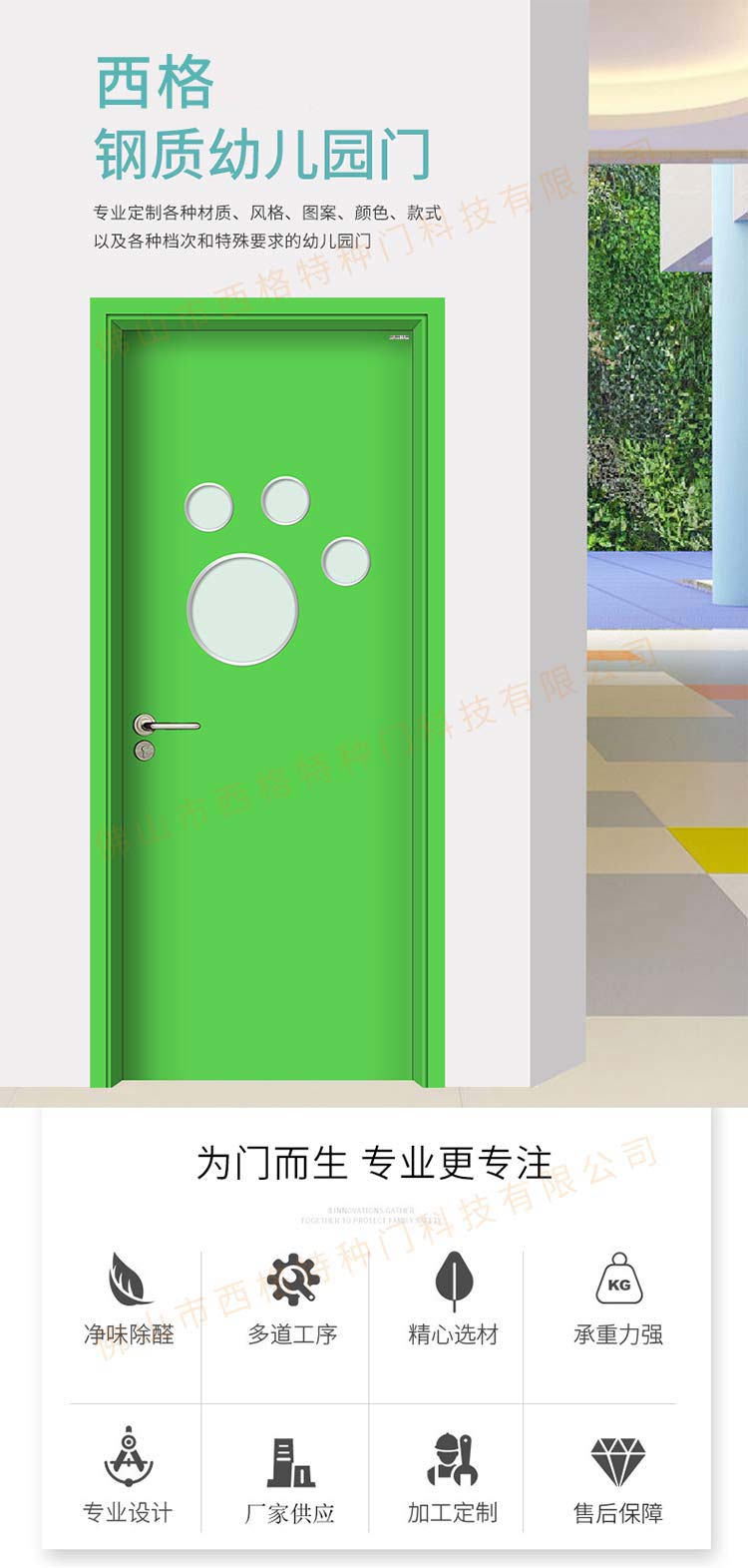 產品簡介:chnsige西格特種門,專業生產幼兒園門,幼兒園鋼質門,鋼質幼兒園門,多鐘款式、顏色,尺寸可定制。