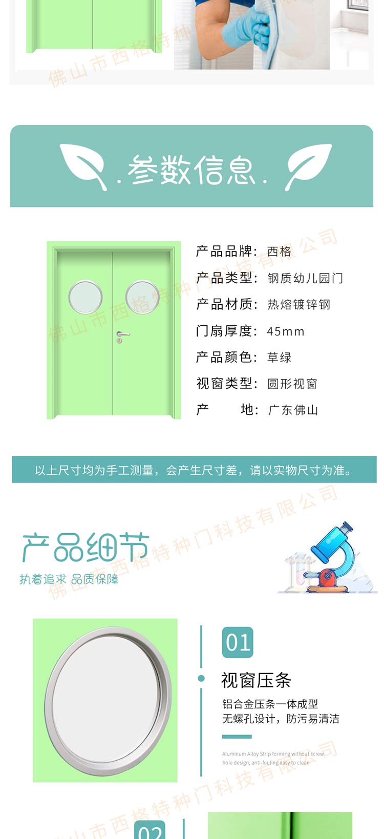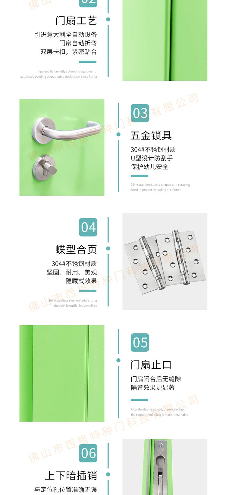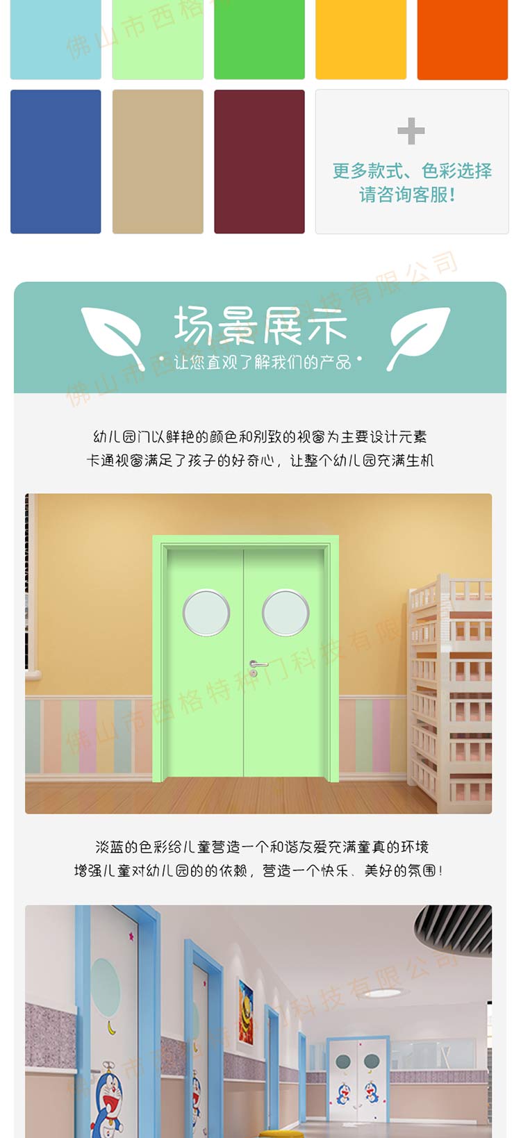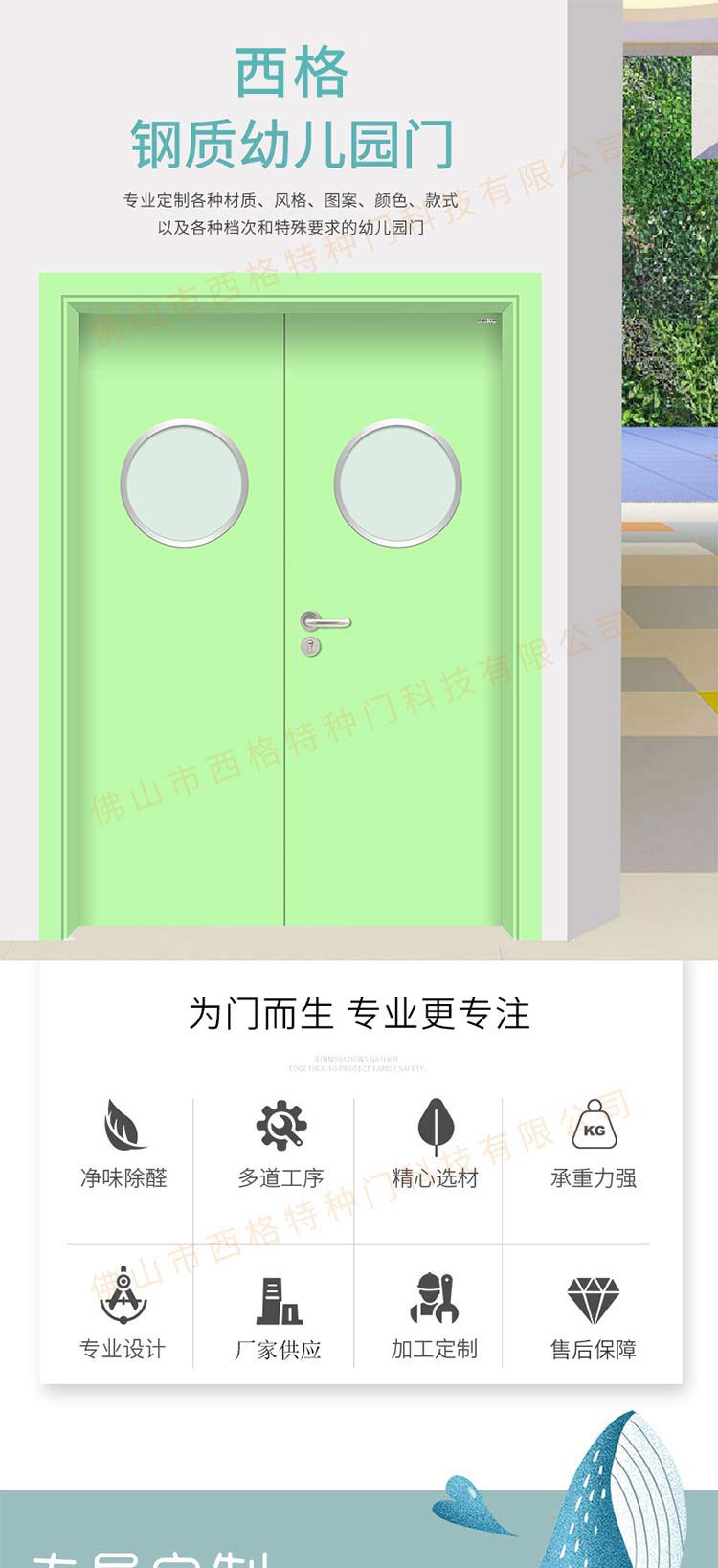 產品簡介:chnsige西格特種門,專業生產幼兒園門,幼兒園鋼質門,鋼質幼兒園門,多鐘款式、顏色,尺寸可定制。