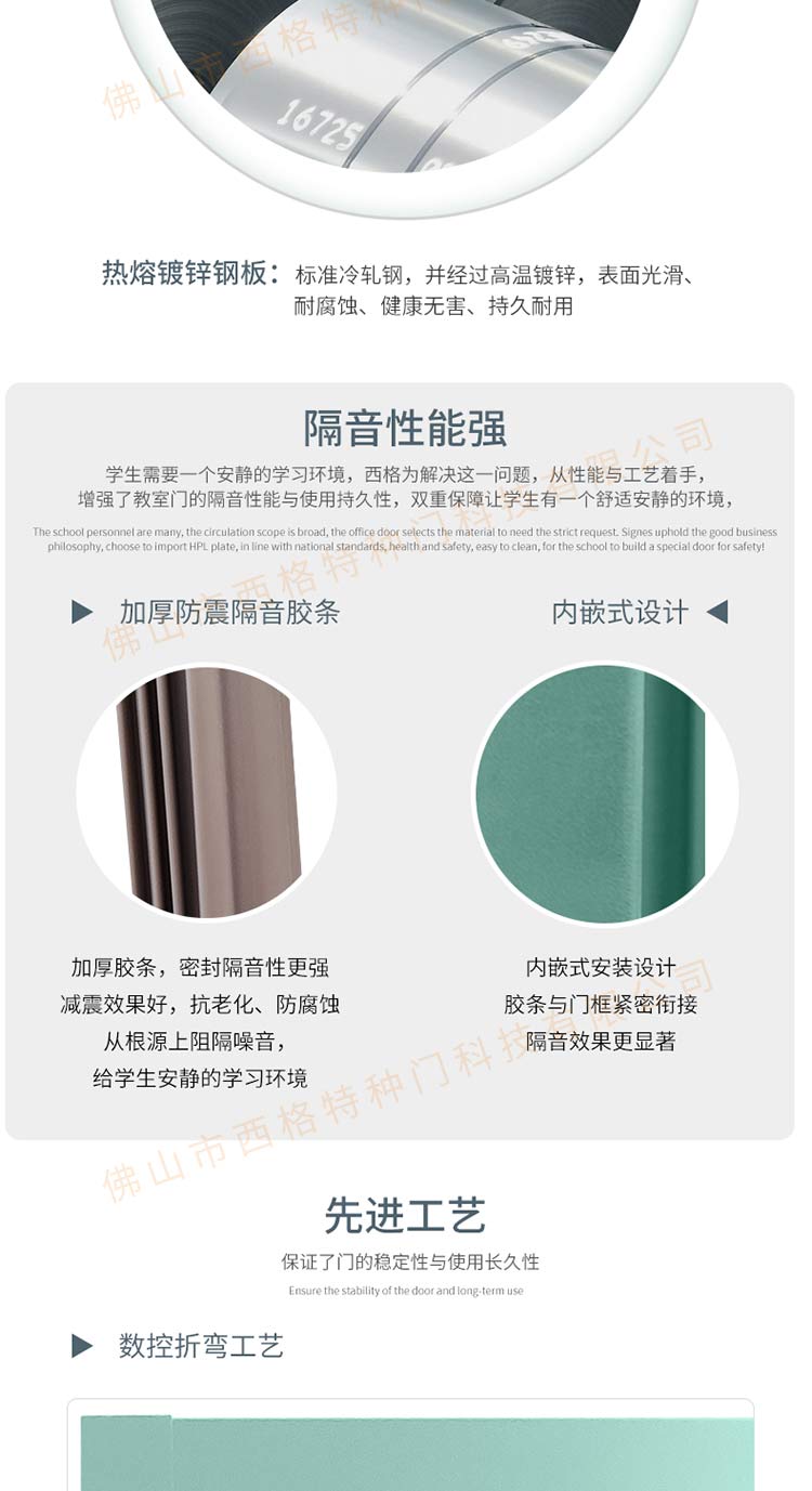 產品簡介:chnsige西格特種門,專業生產教室門,學校教室門,教室門鋼質門,培訓班門,培訓學校門,多鐘款式、顏色,尺寸可定制。