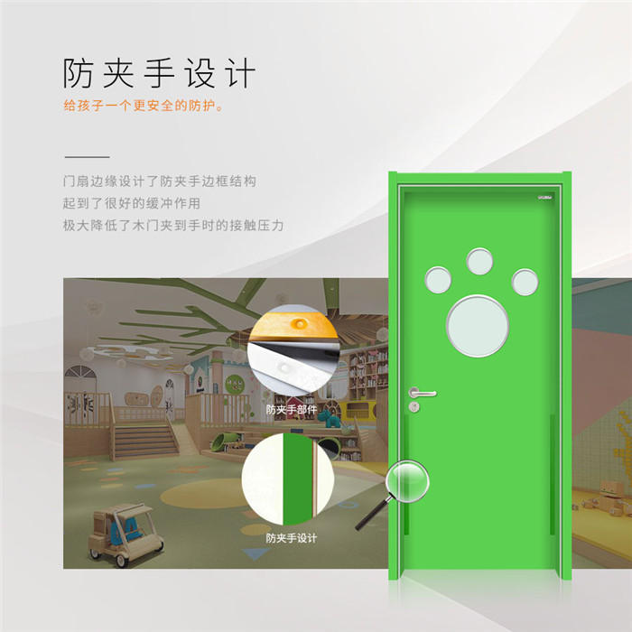 在細節上,西格學校門采用環保硅膠材料,自主研發設計了防夾手膠條,門扇邊緣設計了特殊的防夾手邊框結構,起到了很好的緩沖作用,大大地降低了木門夾到手時的接觸壓力。