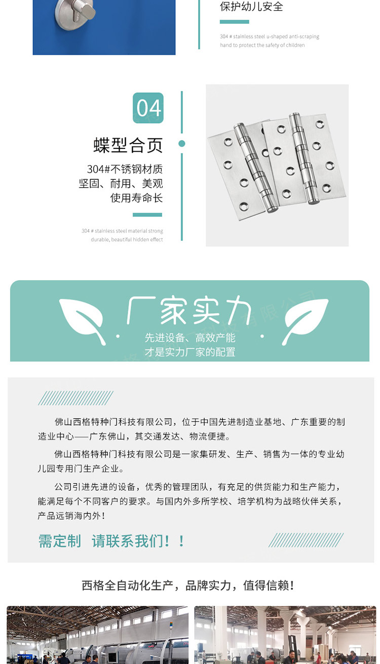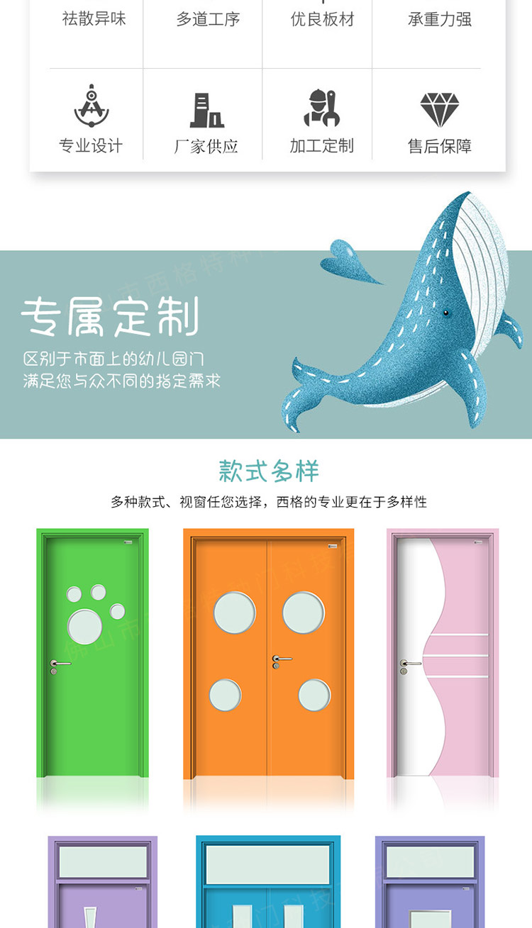產品簡介:chnsige西格特種門,專業生產幼兒園門,木質幼兒園門,幼兒園木門,幼兒園教室門,多鐘款式、顏色,尺寸可定制。