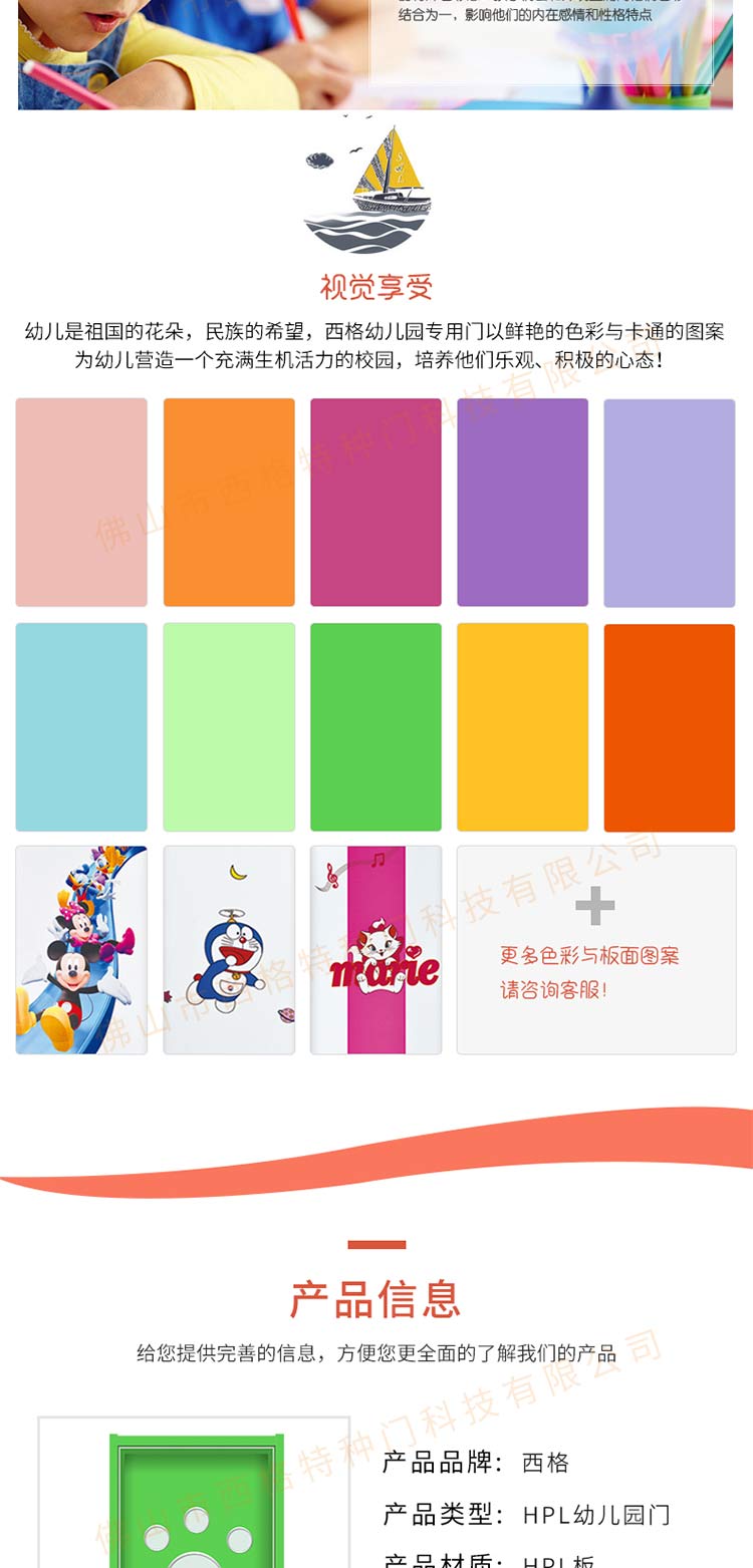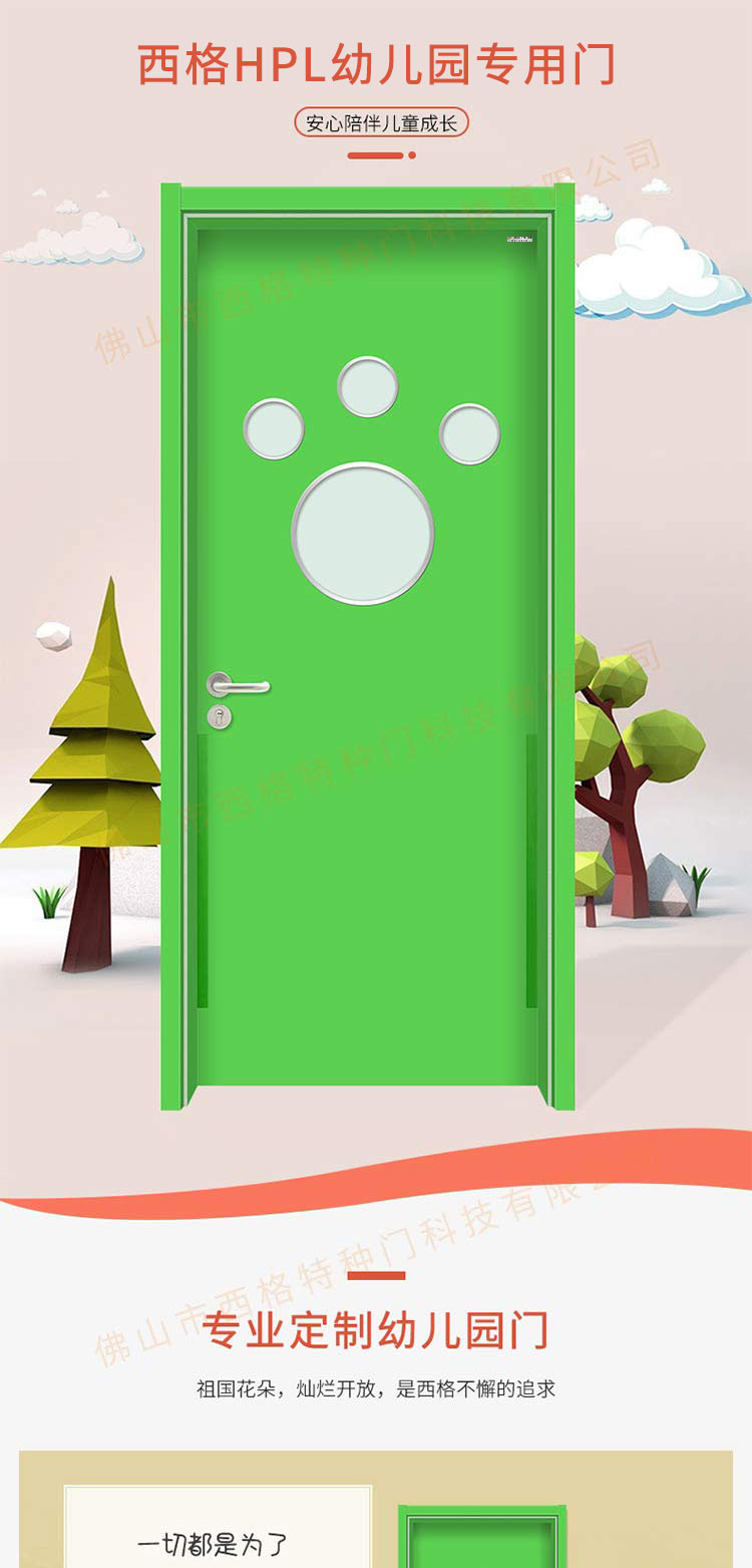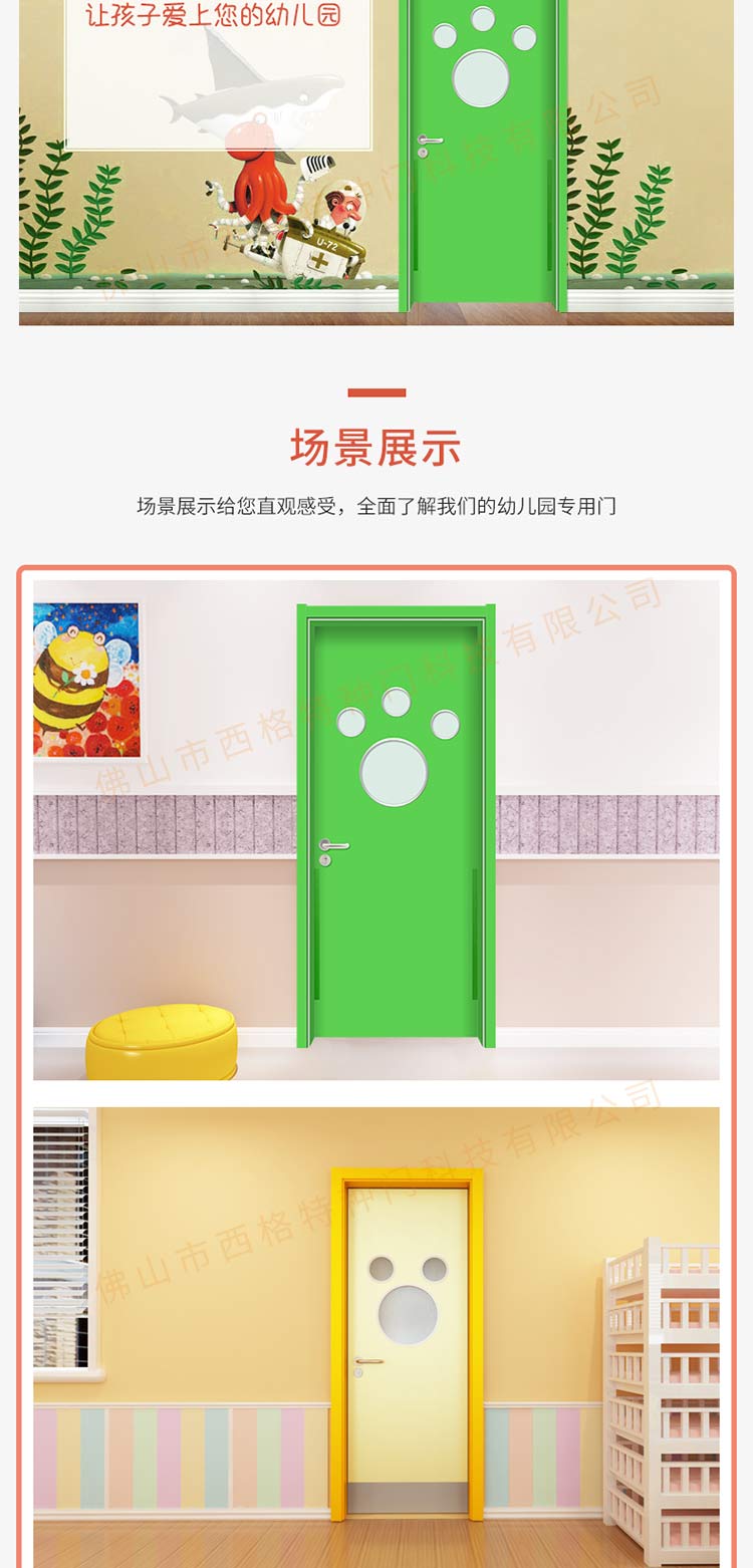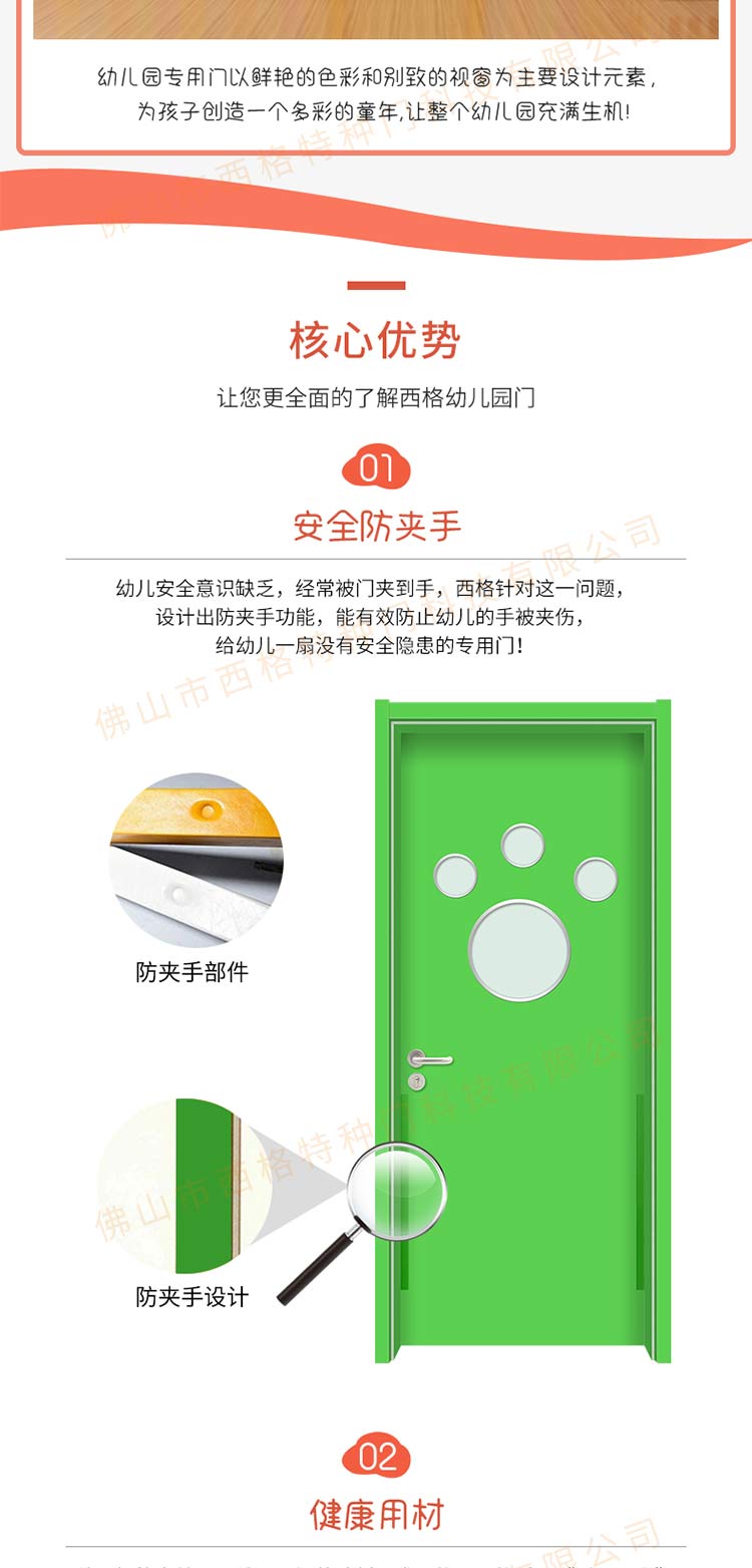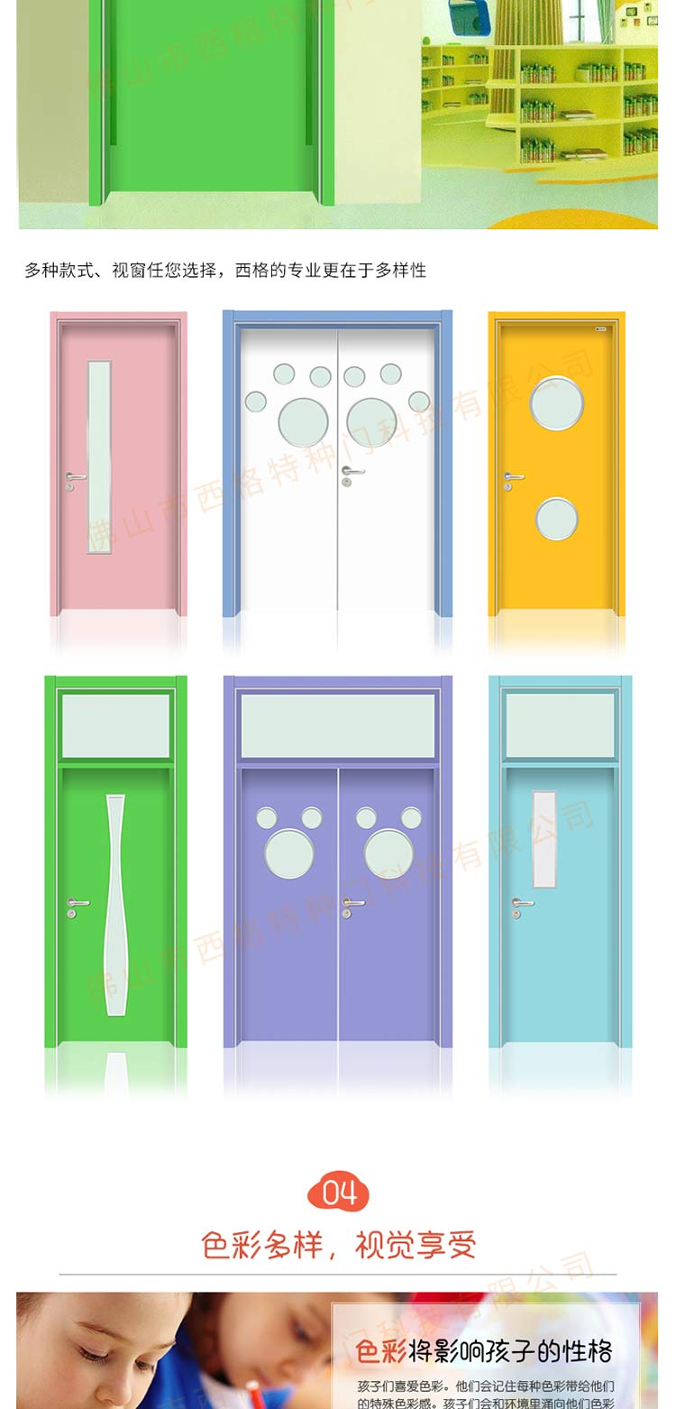 產品簡介:chnsige西格特種門,專業生產幼兒園門,防夾手幼兒園門,多鐘款式、顏色,尺寸可定制。