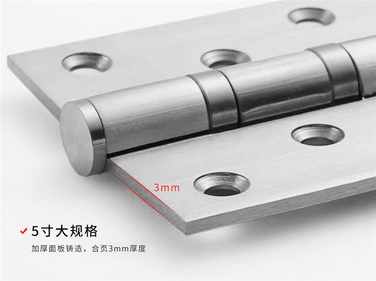 5寸大規(guī)格、3mm不銹鋼厚度,強度高、承重力強,可承受門扇各個方向的載荷,使用壽命長;避免了載荷過大,合頁變形而出現(xiàn)的門扇松動脫落、啟閉不順暢的狀況。