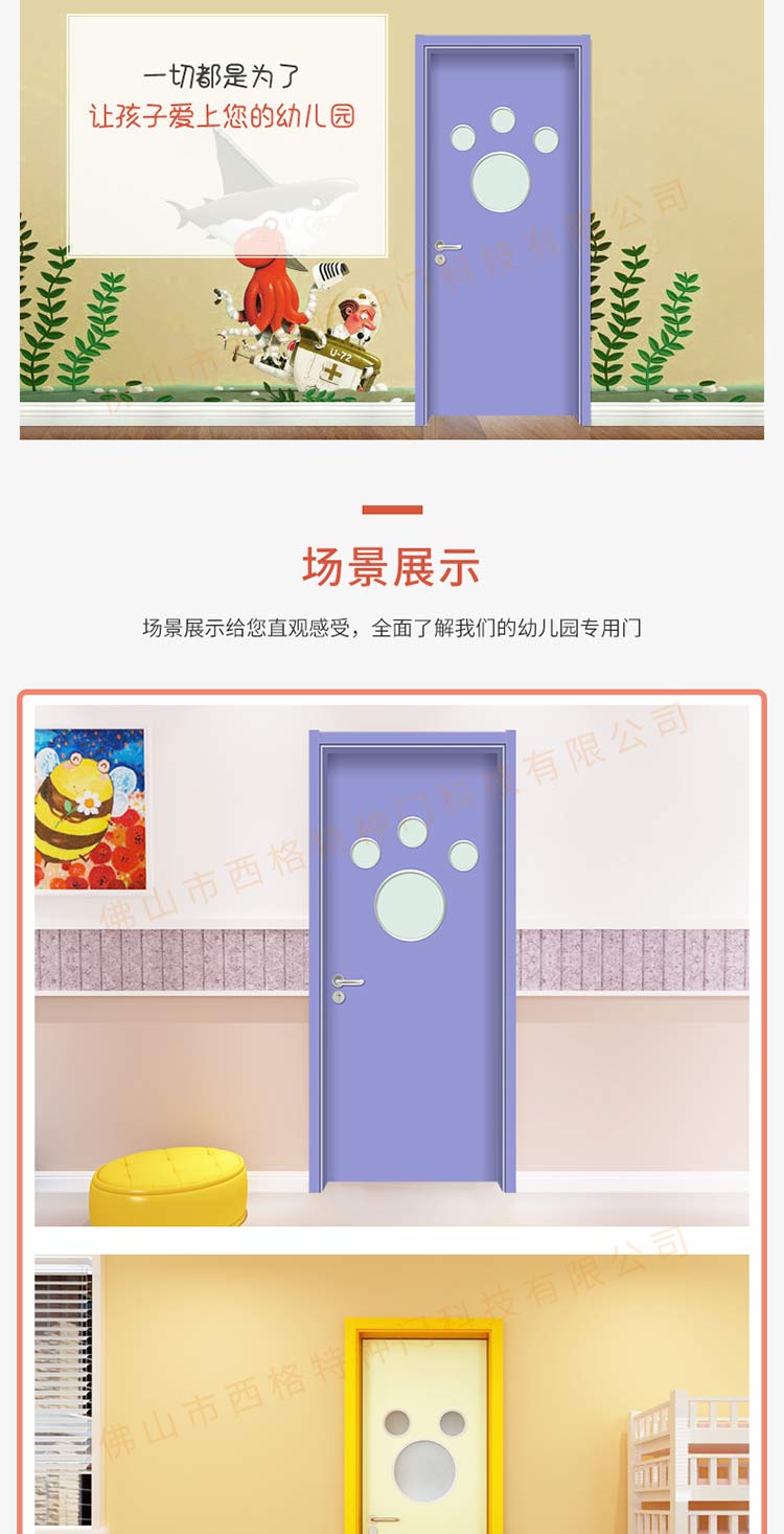 產品簡介:chnsige西格特種門,專業生產幼幼兒園門,木質幼兒園門,幼兒園教室門,幼兒園木門,防夾手門,幼兒園防夾手門,多鐘款式、顏色,尺寸可定制。