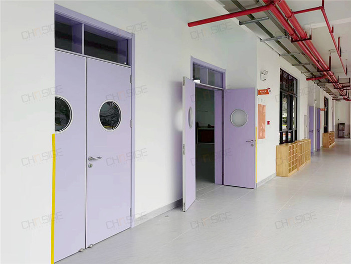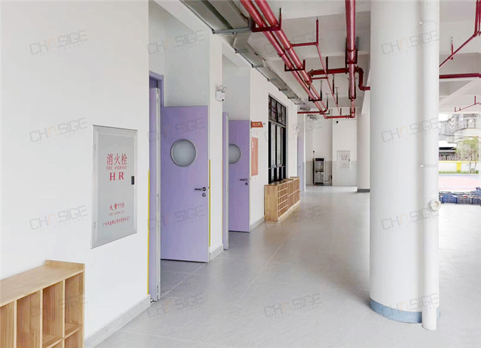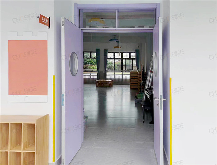 西格的學校門應用于教室和樓道。在設計上,設置雙開門,以開拓視野,并且利用頂部玻璃視窗來改善教學空間的采光環(huán)境,增加空間的通透感,打造明亮的意境,利于激發(fā)孩子想象力;門扇的2個視窗不僅有利于師生觀察室內(nèi)外情況,也增加了趣味性。
